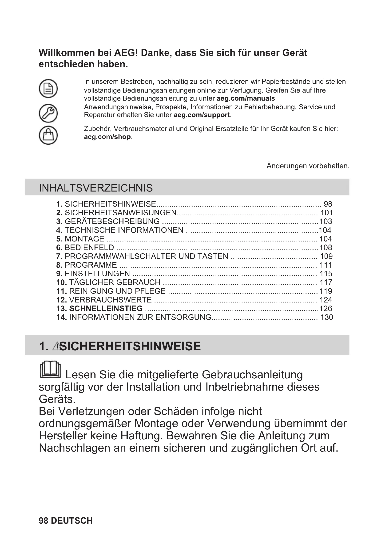 Recyclez les matériaux portant le symbole . Déposez les emballages dans les conteneurs prévus à cet effet. Contribuez à la protection de l'environnement et à votre sécurité, recyclez vos produits électriques et électroniques. Ne jetez pas les appareils portant le symbole avec les ordures ménagères. Emmenez un tel produit dans votre centre local de recyclage ou contactez vos services municipaux. Concerne la France uniquement : FRANÇAIS 97Willkommen bei AEG! Danke, dass Sie sich für unser Gerät entschieden haben. In unserem Bestreben, nachhaltig zu sein, reduzieren wir Papierbestände und stellenvollständige Bedienungsanleitungen online zur Verfügung. Greifen Sie auf Ihrevollständige Bedienungsanleitung zu unter aeg.com/manuals.Anwendungshinweise, Prospekte, Informationen zu Fehlerbehebung, Service undReparatur erhalten Sie unter aeg.com/support.Zubehör, Verbrauchsmaterial und Original-Ersatzteile für Ihr Gerät kaufen Sie hier: aeg.com/shop.Änderungen vorbehalten. INHALTSVERZEICHNIS