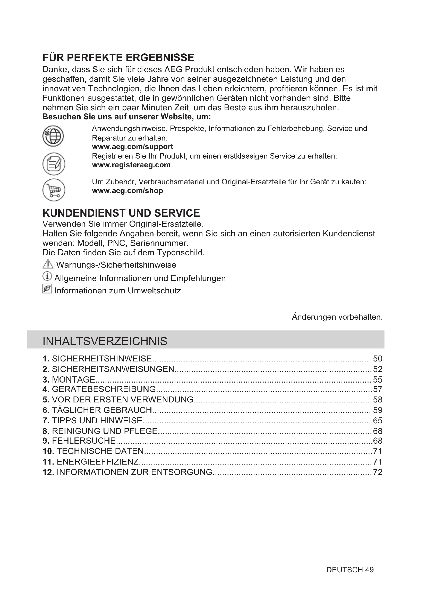 Danke, dass Sie sich für dieses AEG Produkt entschieden haben. Wir haben es geschaffen, damit Sie viele Jahre von seiner ausgezeichneten Leistung und den innovativen Technologien, die Ihnen das Leben erleichtern, profitieren können. Es ist mit Funktionen ausgestattet, die in gewöhnlichen Geräten nicht vorhanden sind. Bitte nehmen Sie sich ein paar Minuten Zeit, um das Beste aus ihm herauszuholen. Besuchen Sie uns auf unserer Website, um: Anwendungshinweise, Prospekte, Informationen zu Fehlerbehebung, Service und Reparatur zu erhalten: www.aeg.com/support Registrieren Sie Ihr Produkt, um einen erstklassigen Service zu erhalten: www.registeraeg.com Um Zubehör, Verbrauchsmaterial und Original-Ersatzteile für Ihr Gerät zu kaufen: www.aeg.com/shop