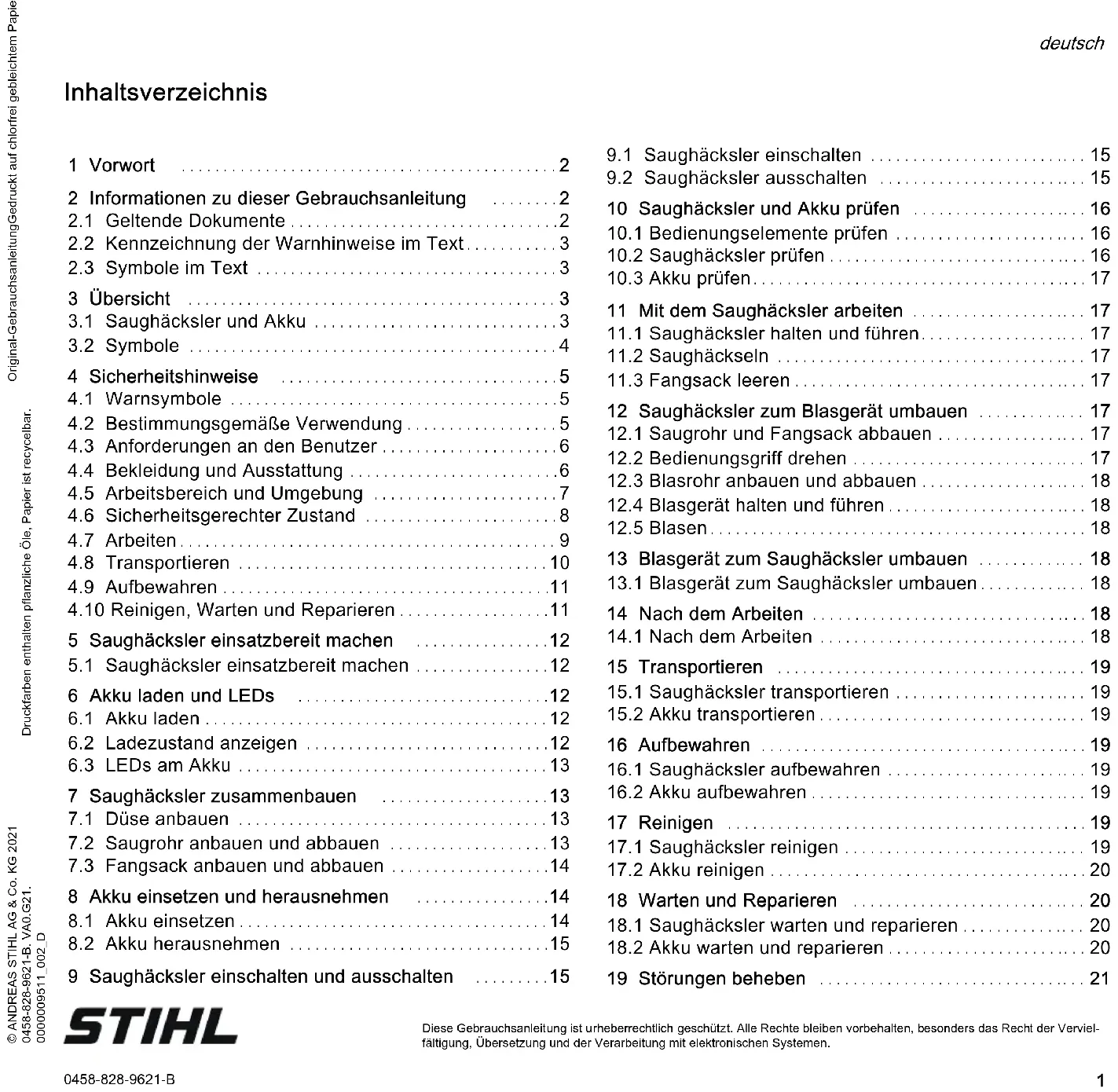Druckfarben enthalten pflanzliche Öle, Papier ist recycelbar. © ANDREAS STIHL AG & Co. KG 2021 0458-828-9621-B. VA0.G21. 0000009511_002_D 0458-828-9621-B deutsch