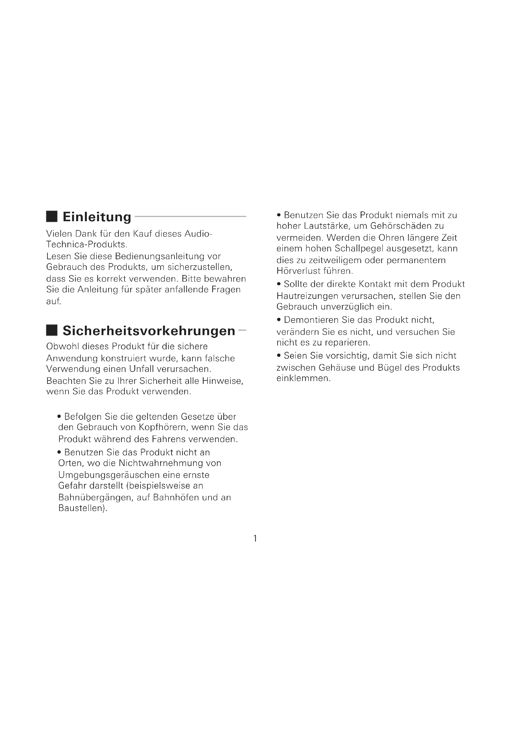 MEMO1 Einleitung Vielen Dank für den Kauf dieses Audio- Technica-Produkts. Lesen Sie diese Bedienungsanleitung vor Gebrauch des Produkts, um sicherzustellen, dass Sie es korrekt verwenden. Bitte bewahren Sie die Anleitung für später anfallende Fragen auf. Sicherheitsvorkehrungen Obwohl dieses Produkt für die sichere Anwendung konstruiert wurde, kann falsche Verwendung einen Unfall verursachen. Beachten Sie zu Ihrer Sicherheit alle Hinweise, wenn Sie das Produkt verwenden.