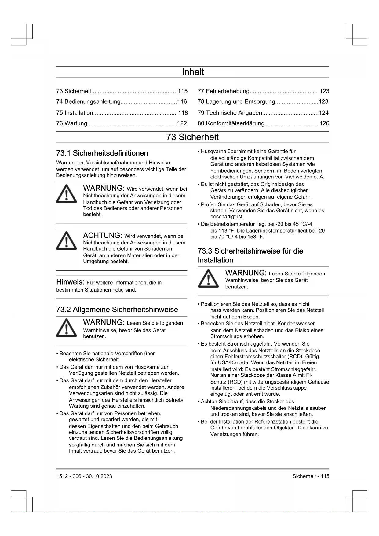 WARNUNG: Lesen Sie vor der Installation des Geräts das Kapitel über Sicherheit, und machen Sie sich damit vertraut. ACHTUNG: Verwenden Sie Originalersatzteile und Originalinstallationsmaterial. Hinweis: Weitere Informationen zur Installation finden Sie unter www.husqvarna.com.