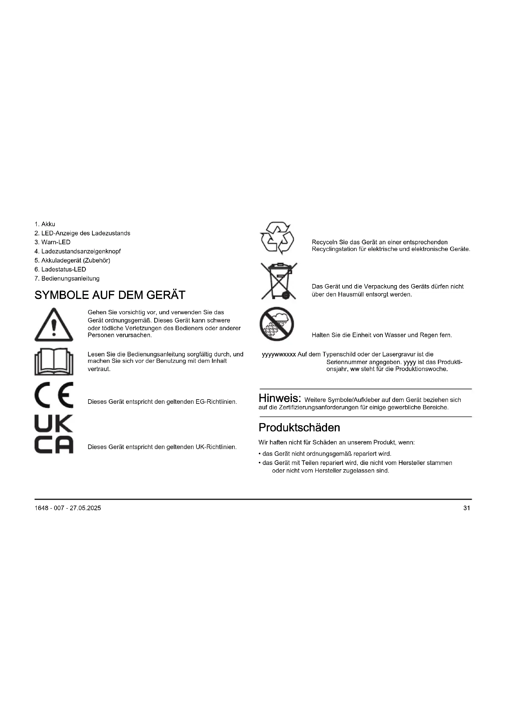 Gehen Sie vorsichtig vor, und verwenden Sie das Gerät ordnungsgemäß. Dieses Gerät kann schwere oder tödliche Verletzungen des Bedieners oder anderer Personen verursachen. Lesen Sie die Bedienungsanleitung sorgfältig durch, und machen Sie sich vor der Benutzung mit dem Inhalt vertraut. Dieses Gerät entspricht den geltenden EG-Richtlinien. Dieses Gerät entspricht den geltenden UK-Richtlinien. Recyceln Sie das Gerät an einer entsprechenden Recyclingstation für elektrische und elektronische Geräte. Das Gerät und die Verpackung des Geräts dürfen nicht über den Hausmüll entsorgt werden. Halten Sie die Einheit von Wasser und Regen fern. yyyywwxxxx Auf dem Typenschild oder der Lasergravur ist die Seriennummer angegeben. yyyy ist das Produkti- onsjahr, ww steht für die Produktionswoche. Hinweis: Weitere Symbole/Aufkleber auf dem Gerät beziehen sich auf die Zertifizierungsanforderungen für einige gewerbliche Bereiche. Produktschäden Wir haften nicht für Schäden an unserem Produkt, wenn: