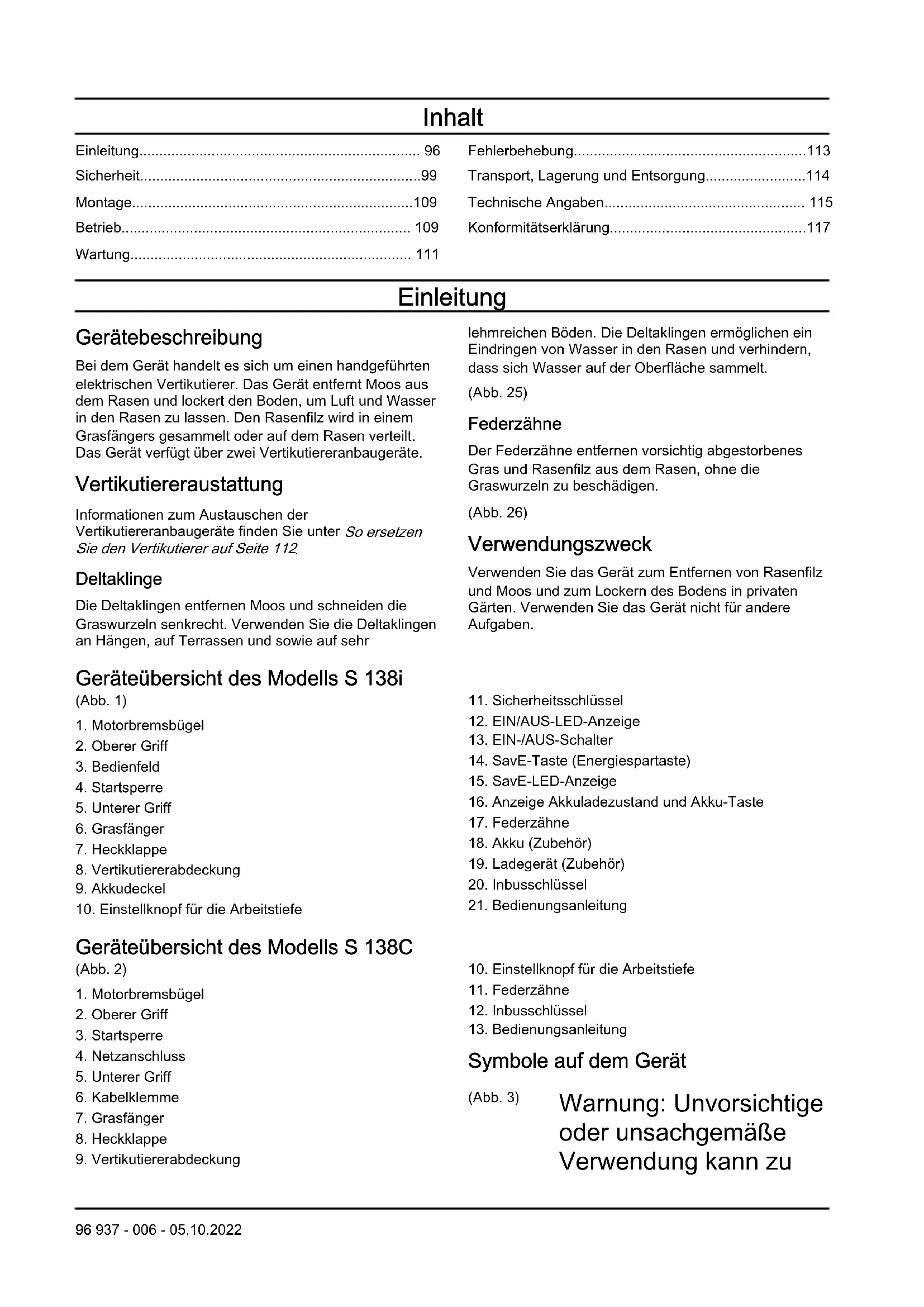 Symbole auf dem Gerät (Abb. 3) Warnung: Unvorsichtige oder unsachgemäße Verwendung kann zu 96 937 - 006 - 05.10.2022Verletzungen oder zum Tode des Bedieners oder anderer Personen führen. (Abb. 4) Lesen Sie die Bedienungsanleitung, und machen Sie sich mit den Anweisungen vertraut, bevor Sie dieses Gerät verwenden. (Abb. 5) Achten Sie auf hochgeschleuderte und abprallende Objekte. (Abb. 6) Andere Personen oder Tiere müssen sich in sicherem Abstand vom Arbeitsbereich befinden. (Abb. 7) Warnung: Halten Sie Hände und Füße von der rotierenden Klinge fern. (Abb. 8) Entfernen Sie den Sicherheitsschlüssel, bevor Sie Wartungsarbeiten am Gerät (Modell S 138i) durchführen. (Abb. 9) Trennen Sie vor Wartungsarbeiten das Gerät (Modell S 138C) vom Stromnetz. (Abb. 10) Stromschlaggefahr (Modell S 138C). (Abb. 11) Setzen Sie das Gerät keinem Regen aus (Modell S 138i). (Abb. 12) Warnung: Mähen Sie nicht über das Netzkabel. Dies kann zu einem elektrischen Schlag und Schäden am Gerät (Modell S 138C) führen. (Abb. 13) Dieses Gerät ist gegen Spritzwasser geschützt. (Abb. 14) Dieses Gerät entspricht den geltenden EAC- Richtlinien. (Abb. 15) Dieses Gerät stimmt mit den geltenden EG- Richtlinien überein. (Abb. 16) Dieses Gerät entspricht den geltenden UK- Richtlinien. (Abb. 17) Dieses Gerät stimmt mit den geltenden UkrSEPRO-Richtlinien überein. (Abb. 18) Etikett mit Geräuschemissionen gemäß EU- und UK-Richtlinien und