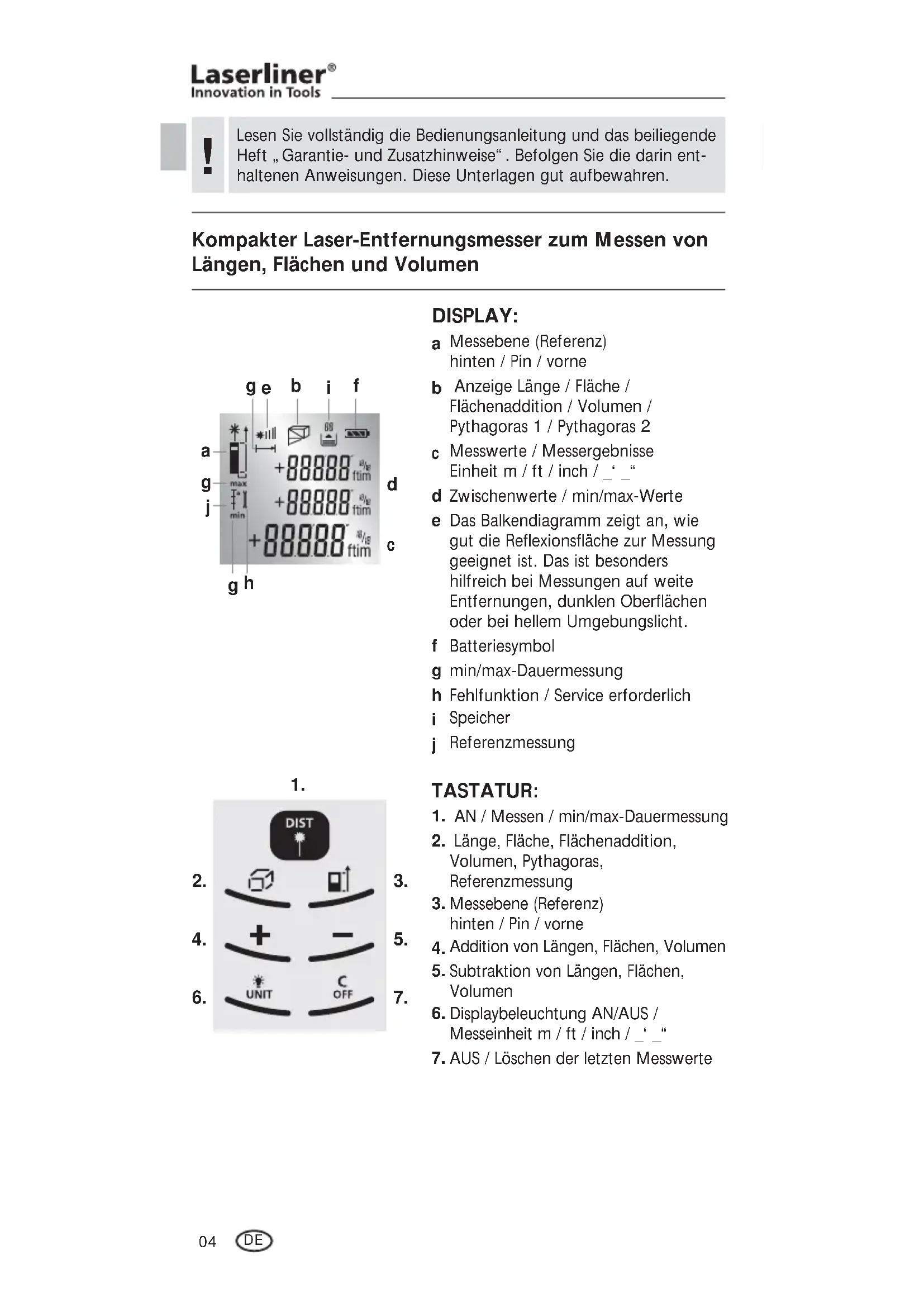 1.3Karte_Manual_DistanceMaster-Pocket_Rev.0612.indd 03 02.08.12 10:24Lesen Sie vollständig die Bedienungsanleitung und das beiliegende Heft „Garantie- und Zusatzhinweise“. Befolgen Sie die darin ent- haltenen Anweisungen. Diese Unterlagen gut aufbewahren.