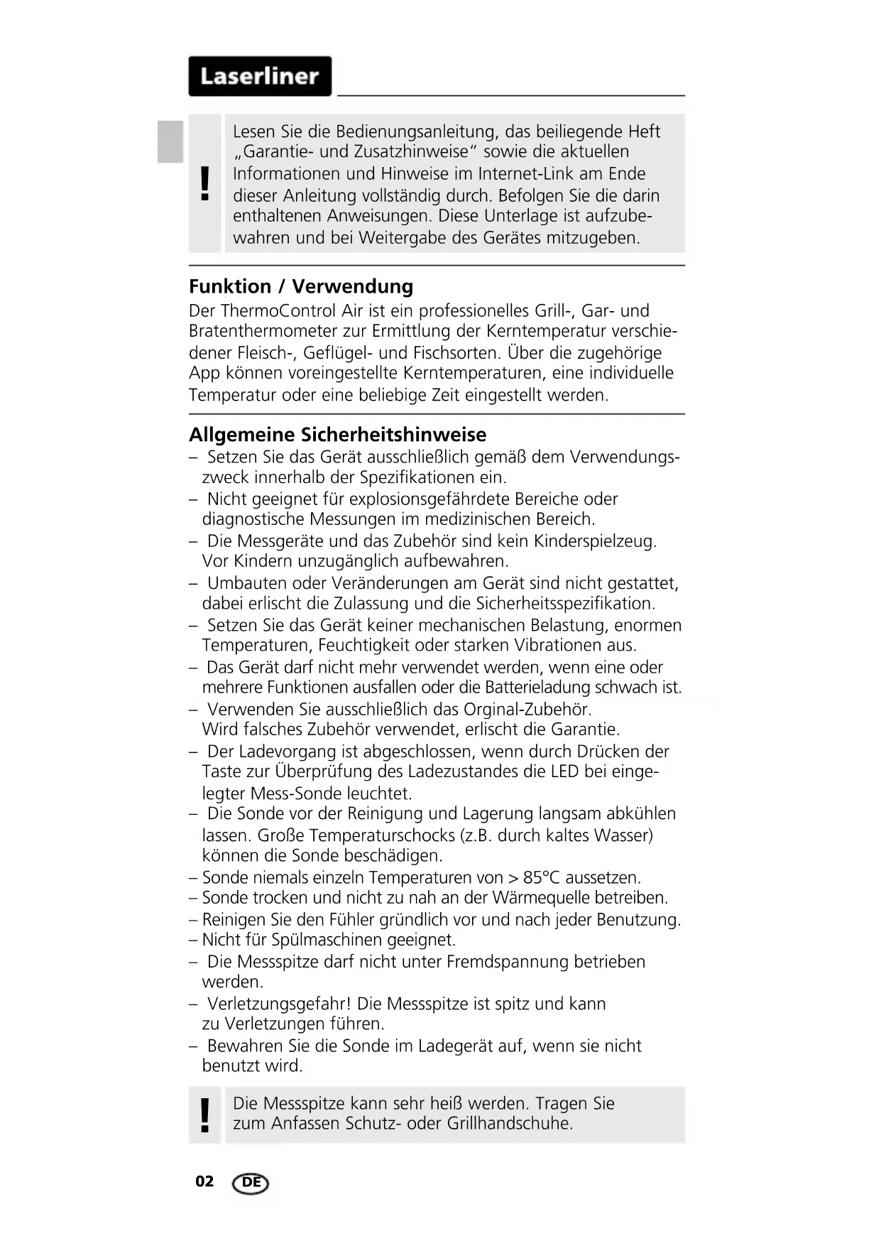 Technische Änderungen vorbehalten. 20W05 EU-Bestimmungen und Entsorgung Das Gerät erfüllt alle erforderlichen Normen für den freien Warenverkehr innerhalb der EU. Dieses Produkt ist ein Elektrogerät und muss nach der europäischen Richtlinie für Elektro- und Elektronik- Altgeräte getrennt gesammelt und entsorgt werden. Weitere Sicherheits- und Zusatzhinweise unter: http://laserliner.com/info?an=AJI Technische Daten Messgröße Kontakttemperatur Umgebungstemperatur Messbereich Kontakttemperatur 0°C … 85°C Genauigkeit Kontakttemperatur ± 1°C Messbereich Um- gebungstemperatur 0°C … 300°C Schutzart IP 66 Stromversorgung 1 x 1,5V LR6 (AA) Betriebsdauer ca. 4 Std. Arbeitsbedingungen Sonde: 0°C … 85°C, Ladeschale: -10°C … 50°C, Luftfeuchtigkeit max. 85% rH, nicht kondensierend, Arbeitshöhe max. 2000 m über NN (Normalnull) Lagerbedingungen -10°C … 60°C, Luftfeuchtigkeit max. 85% rH, nicht kondensierend Betriebsdaten Funkmodul Schnittstelle Bluetooth LE 4.x; Frequenzband: ISM Band 2400-2483.5 MHz, 40 Kanäle; Sendeleistung: max. 10 mW; Bandbreite: 2 MHz; Bitrate: 1 Mbit/s; Modulation: GFSK / FHSS Abmessungen (B x H x T) 168 x 24 x 40 mm Sonde 90 mm, ø 5,9 mm Gewicht 80 g (inkl. Batterie) DE08 Function / Application ThermoControl Air is a professional thermometer for grilling, cooking and roasting that determines the core temperature of various types of meat, poultry and fish. Preset core temperatures, individual temperatures, or a specific time can be set using the linked app. Completely read through the operating instructions, the „Warranty and Additional Information“ booklet as well as the latest information under the internet link at the end of these instructions. Follow the instructions they contain. This document must be kept in a safe place and if the laser device is passed on, this document must be passed on with it.