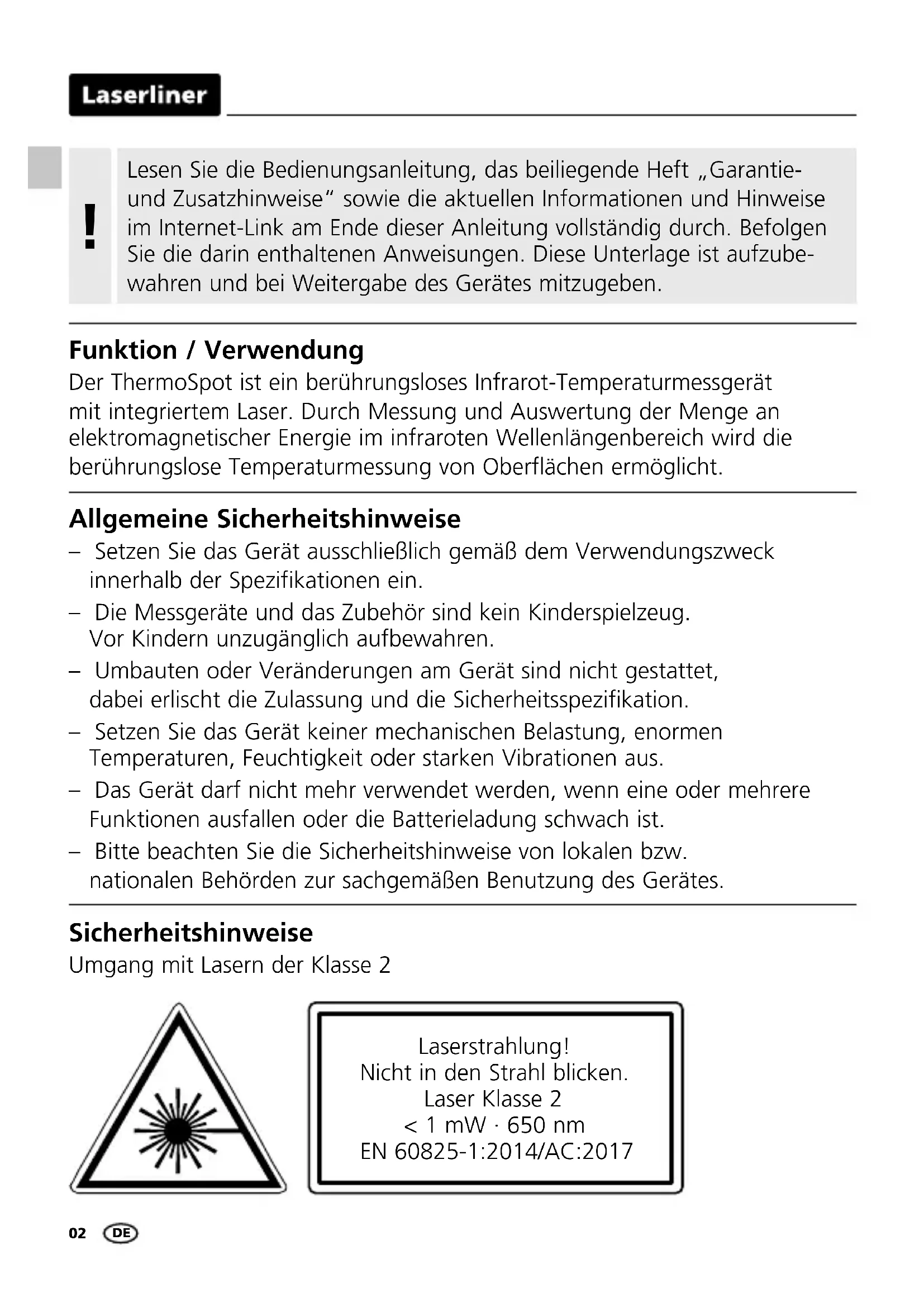 DE DE Laserstrahlung! Nicht in den Strahl blicken. Laser Klasse 2 < 1 mW · 650 nm EN 60825-1:2014/AC:2017 Umgang mit Lasern der Klasse 2 Sicherheitshinweise Allgemeine Sicherheitshinweise – Setzen Sie das Gerät ausschließlich gemäß dem Verwendungszweck innerhalb der Spezifikationen ein. – Die Messgeräte und das Zubehör sind kein Kinderspielzeug. Vor Kindern unzugänglich aufbewahren. – Umbauten oder Veränderungen am Gerät sind nicht gestattet, dabei erlischt die Zulassung und die Sicherheitsspezifikation. – Setzen Sie das Gerät keiner mechanischen Belastung, enormen Temperaturen, Feuchtigkeit oder starken Vibrationen aus. – Das Gerät darf nicht mehr verwendet werden, wenn eine oder mehrere Funktionen ausfallen oder die Batterieladung schwach ist. – Bitte beachten Sie die Sicherheitshinweise von lokalen bzw. nationalen Behörden zur sachgemäßen Benutzung des Gerätes. Lesen Sie die Bedienungsanleitung, das beiliegende Heft „Garantie- und Zusatzhinweise“ sowie die aktuellen Informationen und Hinweise im Internet-Link am Ende dieser Anleitung vollständig durch. Befolgen Sie die darin enthaltenen Anweisungen. Diese Unterlage ist aufzube- wahren und bei Weitergabe des Gerätes mitzugeben.