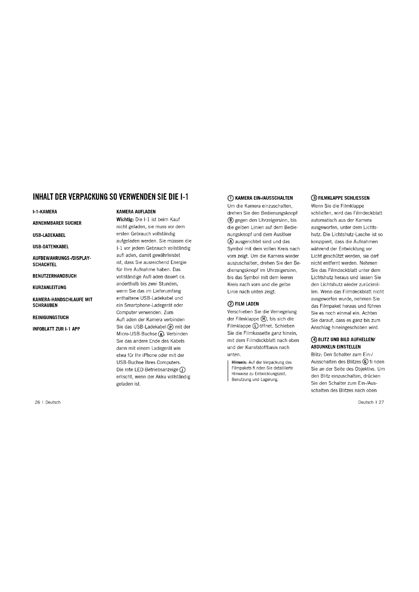 Um die Walzen der Kamera zu säubern, muß zunächst sicher- gestellt werden, dass die Kamera ausgeschaltet ist. Danach kann die Filmtür geöffnet werden (L) - die Walzen sind zwei silberfarbene Stifte innerhalb der Tür. Dann mit beiden Daumen auf beiden Seiten der Walzen leicht in Richtung des Deutsch | 33 Innenraums drehen und dabei mit einem feuchten Tuch die Walzen reinigen. Auf keinen Fall sind chemische Reinigungsmittel zu verwenden, da diese die Kamera beschädigen können.Bevor die Kameratür geschlossen wird, sollte die Kamera eingeschaltet werden, damit die korrekte Position der Walzen eingestellt wird. STROMVERSORGUNG Laden Sie die I-1 vor jedem Gebrauch vollständig auf, damit gewährleistet ist, dass Sie ausreichend Energie für Ihre Aufnahme haben (siehe