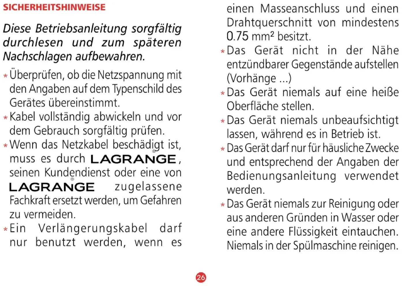 Minuten ziehen. Garen Sie die Fischstückchen auf dem Stein. Servieren Sie das Ganze mit Toastsbrot und frischer Salzbutter. 36GARANTIEBEDINGUNGEN Garantie auf -Geräte Wir garantieren Ihr Gerät für eine Dauer von 2 Jahren. Um von einem kostenlosen zusätzlichen Garantiejahr zu protieren, registrieren Sie sich bitte auf der -Website (www.lagrange.fr). Die Garantie umfasst Teile und Arbeitskosten und deckt Herstellungsfehler ab. Von der Garantie ausgeschlossen sind: Schäden, die durch unsachgemäßen Gebrauch oder Nichtbeachtung der Gebrauchsanweisung entstanden sind, sowie Bruch durch Herunterfallen. DIESE GARANTIE GILT NUR FÜR DEN HÄUSLICHEN GEBRAUCH, NICHT FÜR DEN PROFESSIONELLEN ODER SEMIPROFESSIONELLEN GEBRAUCH. Die vom Verkäufer geschuldete gesetzliche Gewährleistung schließt die vom Hersteller geschuldete gesetzliche Gewährleistung für Mängel oder versteckte Fehler gemäß Artikel 1641 bis 1649 des frz. Zivilgesetzbuchs nicht aus. Bei einem Fehler oder einer Störung wenden Sie sich bitte an Ihren Fachhändler. Im Falle eines technischen Defekts innerhalb von 8 Tagen nach dem Kauf werden die Geräte umgetauscht. Nach Ablauf dieses Zeitraums werden sie durch den -Kundendienst repariert. Um diese Garantie in Anspruch nehmen zu können, muss der Benutzer zwingend eine Kopie der Rechnung vorlegen, auf der das Kaufdatum des Geräts vermerkt ist. Dauer der Verfügbarkeit von Ersatzteilen Gemäß Artikel L 111-2 des französischen Verbraucherschutzgesetzes beträgt die Verfügbarkeit von Ersatzteilen, die wir für ein reparaturfähiges Produkt bereitstellen, 5 Jahre ab dem Herstellungsdatum. Diese Verfügbarkeit ist jedoch nur in dem Land gewährleistet, in dem das Produkt gekauft wurde. Versandkosten für Rücksendungen Nach Ablauf des ersten Jahres der Händlergewährleistung müssen Sie nur die Kosten für den Rückversand an das Werk tragen, die Rücksendung erfolgt dann schnellstmöglich auf unsere Kosten. Wenn Sie weitere Fragen zu unseren Produkten haben, können Sie uns unter folgender Adresse kontaktieren: Service consommateurs 17, chemin de la Plaine ZA Les Plattes CS30228