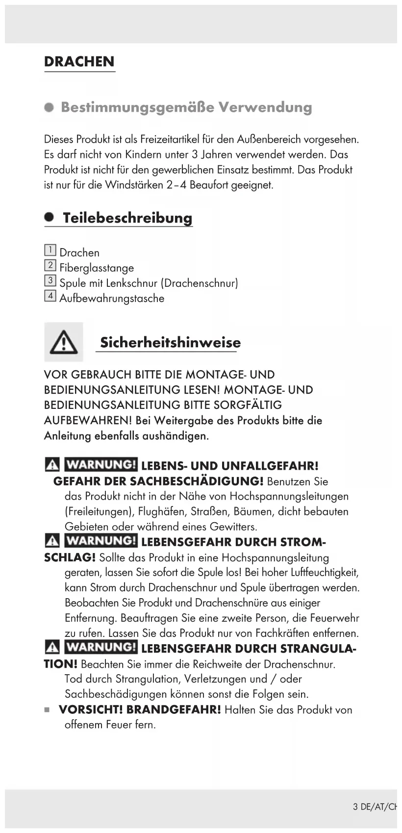 TION! Beachten Sie immer die Reichweite der Drachenschnur. Tod durch Strangulation, Verletzungen und / oder Sachbeschädigungen können sonst die Folgen sein. VORSICHT! BRANDGEFAHR! Halten Sie das Produkt von offenem Feuer fern.4 DE / AT / CH LEBENS- UND UNFALLGEFAHR! Stellen Sie sicher, dass sich niemand in der Flugreichweite befindet, wenn Sie das Produkt benutzen. Die sicherste Position zur Beobachtung von Drachen ist hinter der Person, die den Drachen steigen lässt. VORSICHT! VERLETZUNGSGEFAHR! Durch heftige Windstöße kann die Spule zerbrechen bzw. die Drachenschnur reißen. Tragen Sie deshalb Schutzhandschuhe, wenn Sie das Produkt benutzen.