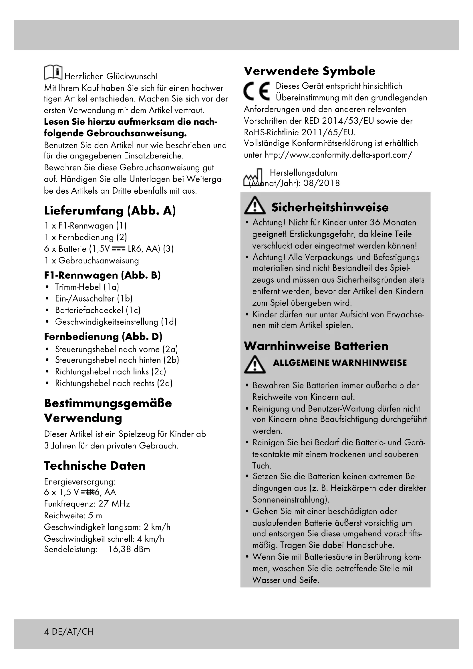 - Richtungshebel nach rechts (2d) Bestimmungsgemäße Verwendung Dieser Artikel ist ein Spielzeug für Kinder ab 3 Jahren für den privaten Gebrauch. Technische Daten Energieversorgung: 6 x 1,5 V LR6, AA Funkfrequenz: 27 MHz Reichweite: 5 m Geschwindigkeit langsam: 2 km/h Geschwindigkeit schnell: 4 km/h Sendeleistung: – 16,38 dBm Verwendete Symbole Dieses Gerät entspricht hinsichtlich Übereinstimmung mit den grundlegenden Anforderungen und den anderen relevanten Vorschriften der RED 2014/53/EU sowie der RoHS-Richtlinie 2011/65/EU. Vollständige Konformitätserklärung ist erhältlich unter http://www.conformity.delta-sport.com/ Herstellungsdatum (Monat/Jahr): 08/2018 Sicherheitshinweise