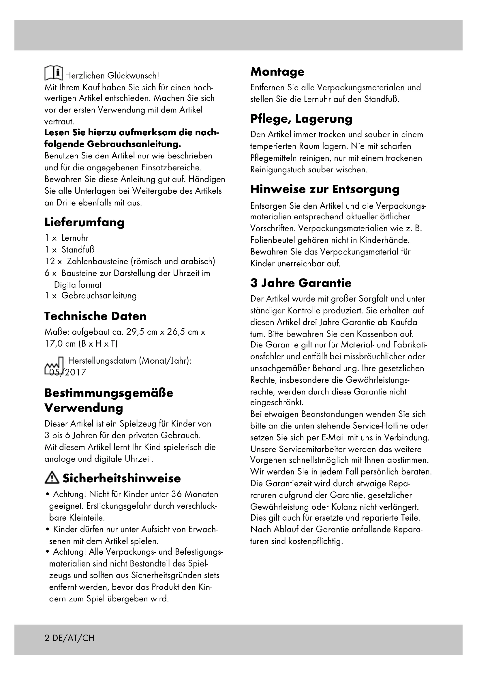Manual de instrucciones2 DE/AT/CH Herzlichen Glückwunsch! Mit Ihrem Kauf haben Sie sich für einen hoch- wertigen Artikel entschieden. Machen Sie sich vor der ersten Verwendung mit dem Artikel vertraut. Lesen Sie hierzu aufmerksam die nach- folgende Gebrauchsanleitung. Benutzen Sie den Artikel nur wie beschrieben und für die angegebenen Einsatzbereiche. Bewahren Sie diese Anleitung gut auf. Händigen Sie alle Unterlagen bei Weitergabe des Artikels an Dritte ebenfalls mit aus. Lieferumfang 1 x Lernuhr 1 x Standfuß 12 x Zahlenbausteine (römisch und arabisch) 6 x Bausteine zur Darstellung der Uhrzeit im Digitalformat 1 x Gebrauchsanleitung Technische Daten Maße: aufgebaut ca. 29,5 cm x 26,5 cm x 17,0 cm (B x H x T) Herstellungsdatum (Monat/Jahr): 05/2017 Bestimmungsgemäße Verwendung Dieser Artikel ist ein Spielzeug für Kinder von 3 bis 6 Jahren für den privaten Gebrauch. Mit diesem Artikel lernt Ihr Kind spielerisch die analoge und digitale Uhrzeit. Sicherheitshinweise