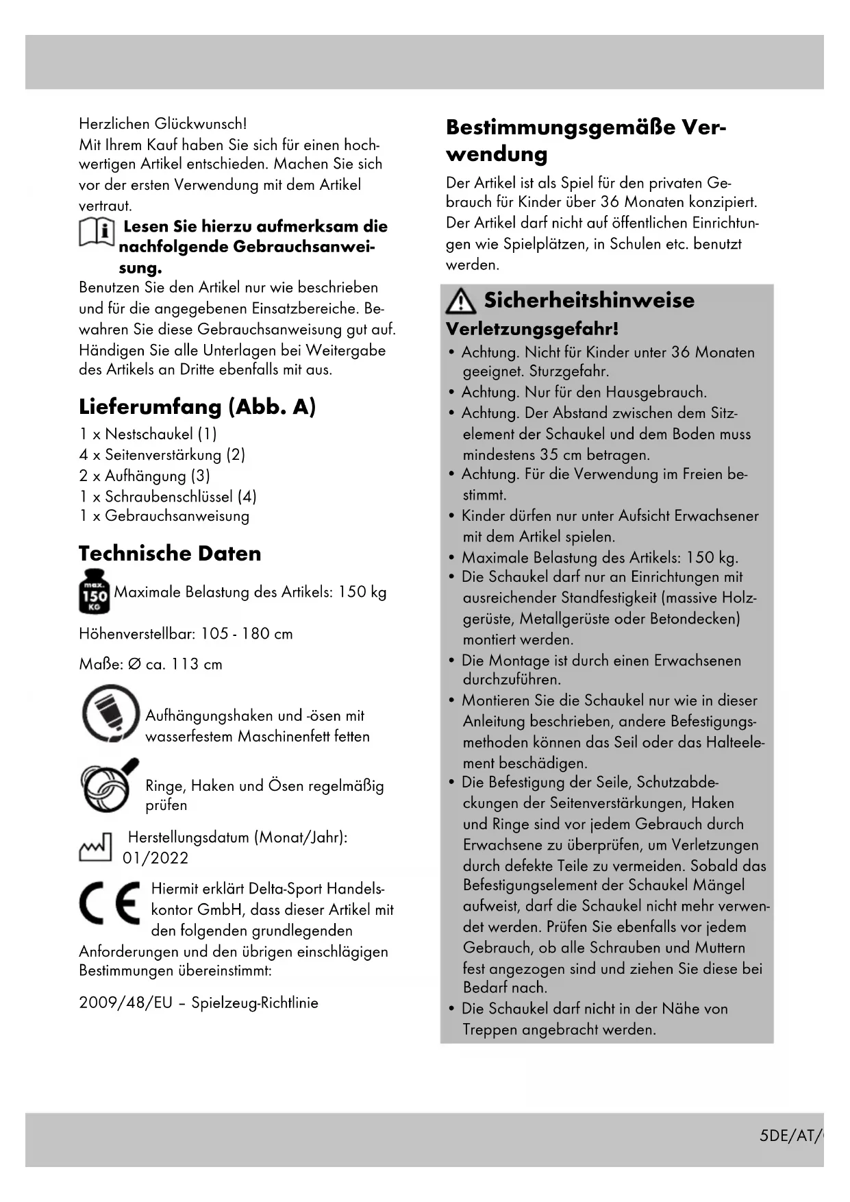F5DE/AT/CH Herzlichen Glückwunsch! Mit Ihrem Kauf haben Sie sich für einen hoch- wertigen Artikel entschieden. Machen Sie sich vor der ersten Verwendung mit dem Artikel vertraut. Lesen Sie hierzu aufmerksam die nachfolgende Gebrauchsanwei- sung. Benutzen Sie den Artikel nur wie beschrieben und für die angegebenen Einsatzbereiche. Be- wahren Sie diese Gebrauchsanweisung gut auf. Händigen Sie alle Unterlagen bei Weitergabe des Artikels an Dritte ebenfalls mit aus. Lieferumfang (Abb. A) 1 x Nestschaukel (1) 4 x Seitenverstärkung (2) 2 x Aufhängung (3) 1 x Schraubenschlüssel (4) 1 x Gebrauchsanweisung Technische Daten Maximale Belastung des Artikels: 150 kg Höhenverstellbar: 105 - 180 cm Maße: Ø ca. 113 cm Aufhängungshaken und -ösen mit wasserfestem Maschinenfett fetten Ringe, Haken und Ösen regelmäßig prüfen Herstellungsdatum (Monat/Jahr): 01/2022 Hiermit erklärt Delta-Sport Handels- kontor GmbH, dass dieser Artikel mit den folgenden grundlegenden Anforderungen und den übrigen einschlägigen Bestimmungen übereinstimmt: 2009/48/EU – Spielzeug-Richtlinie Bestimmungsgemäße Ver- wendung Der Artikel ist als Spiel für den privaten Ge- brauch für Kinder über 36 Monaten konzipiert. Der Artikel darf nicht auf öffentlichen Einrichtun- gen wie Spielplätzen, in Schulen etc. benutzt werden. Sicherheitshinweise Verletzungsgefahr!