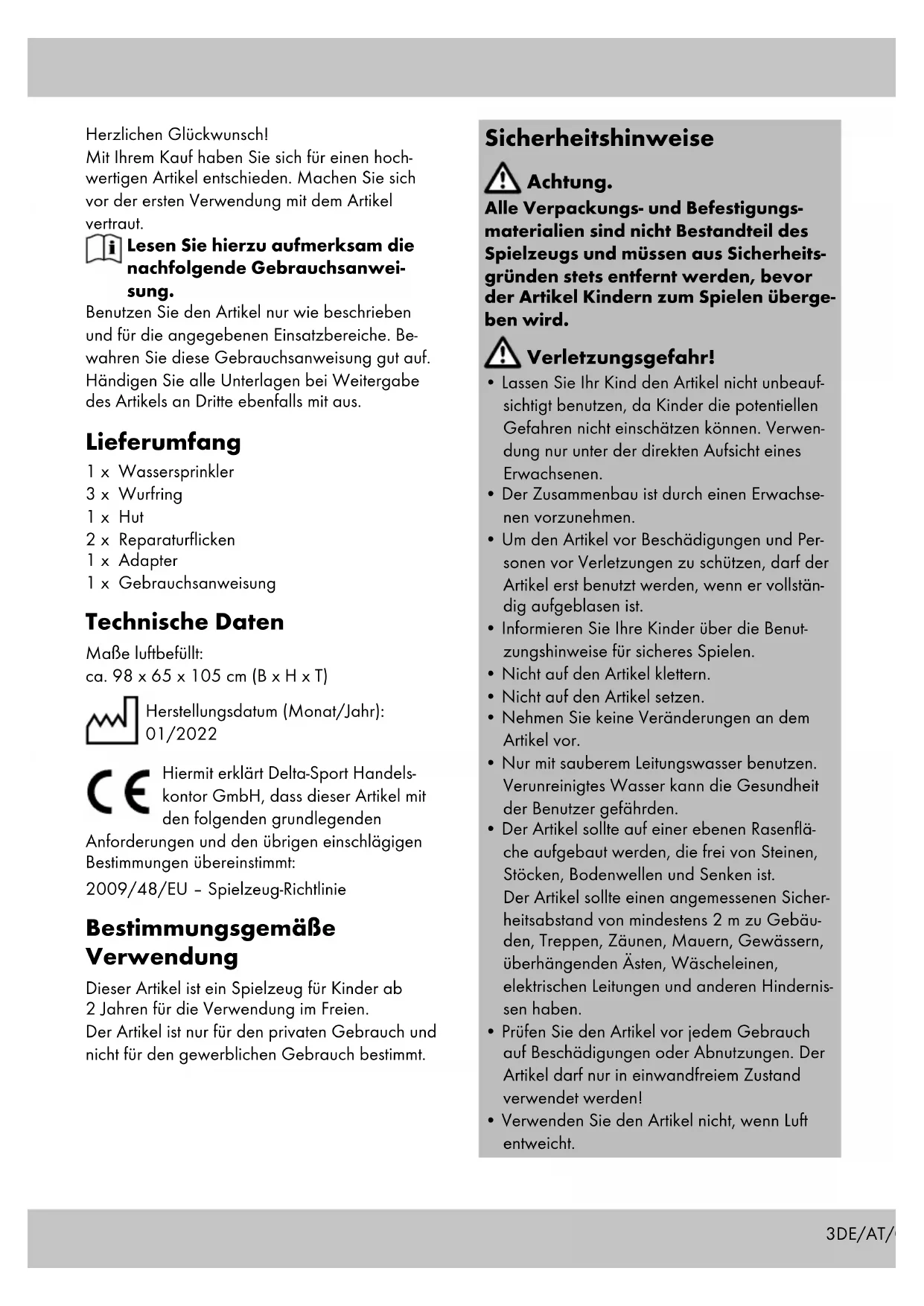 E3DE/AT/CH Herzlichen Glückwunsch! Mit Ihrem Kauf haben Sie sich für einen hoch- wertigen Artikel entschieden. Machen Sie sich vor der ersten Verwendung mit dem Artikel vertraut. Lesen Sie hierzu aufmerksam die nachfolgende Gebrauchsanwei- sung. Benutzen Sie den Artikel nur wie beschrieben und für die angegebenen Einsatzbereiche. Be- wahren Sie diese Gebrauchsanweisung gut auf. Händigen Sie alle Unterlagen bei Weitergabe des Artikels an Dritte ebenfalls mit aus. Lieferumfang 1 x Wassersprinkler 3 x Wurfring 1 x Hut 2 x Reparaturflicken 1 x Adapter 1 x Gebrauchsanweisung Technische Daten Maße luftbefüllt: ca. 98 x 65 x 105 cm (B x H x T) Herstellungsdatum (Monat/Jahr): 01/2022 Hiermit erklärt Delta-Sport Handels- kontor GmbH, dass dieser Artikel mit den folgenden grundlegenden Anforderungen und den übrigen einschlägigen Bestimmungen übereinstimmt: 2009/48/EU – Spielzeug-Richtlinie Bestimmungsgemäße Verwendung Dieser Artikel ist ein Spielzeug für Kinder ab 2 Jahren für die Verwendung im Freien. Der Artikel ist nur für den privaten Gebrauch und nicht für den gewerblichen Gebrauch bestimmt. Sicherheitshinweise Achtung. Alle Verpackungs- und Befestigungs- materialien sind nicht Bestandteil des Spielzeugs und müssen aus Sicherheits- gründen stets entfernt werden, bevor der Artikel Kindern zum Spielen überge- ben wird. Verletzungsgefahr!