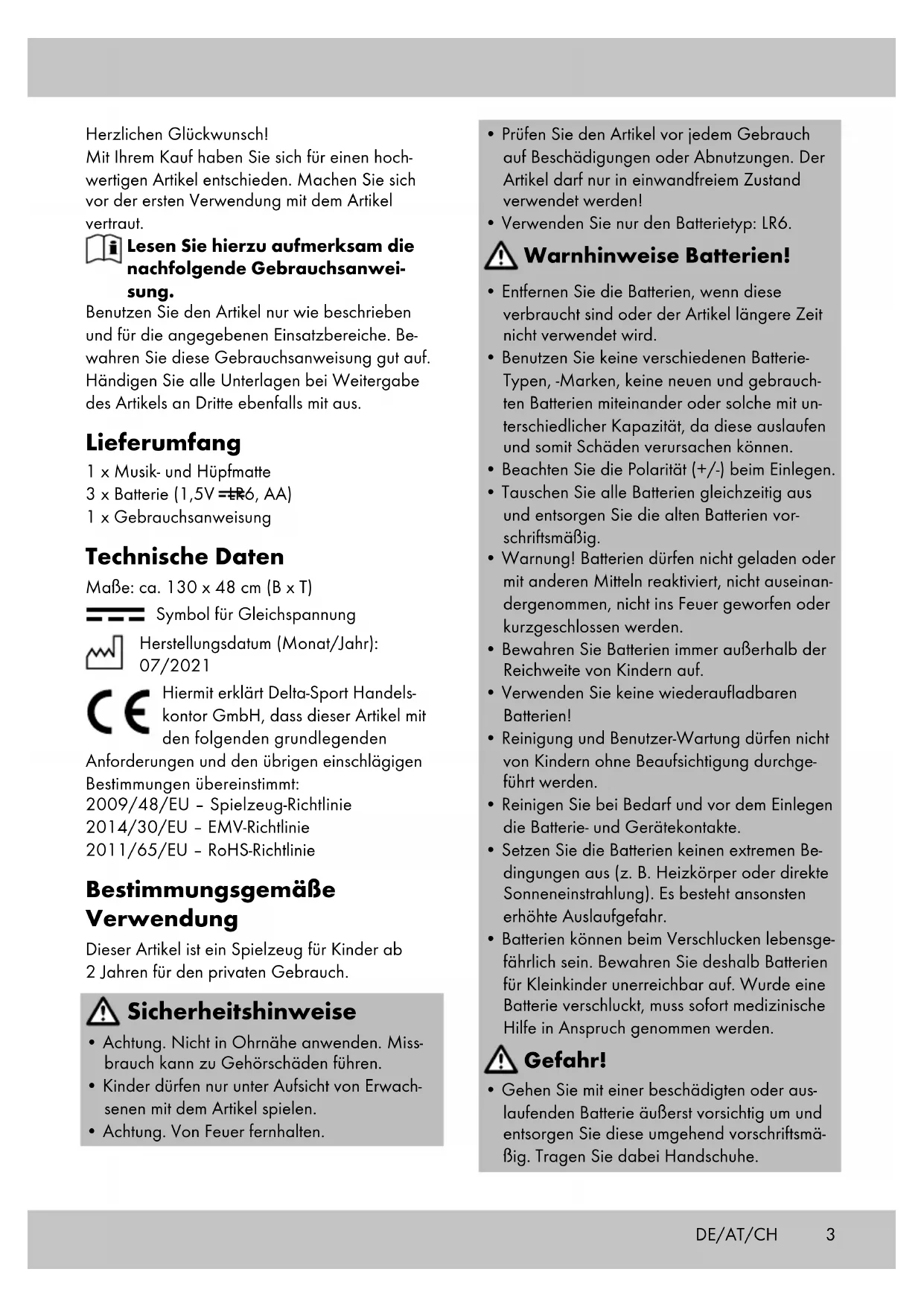 Herzlichen Glückwunsch! Mit Ihrem Kauf haben Sie sich für einen hoch- wertigen Artikel entschieden. Machen Sie sich vor der ersten Verwendung mit dem Artikel vertraut. Lesen Sie hierzu aufmerksam die nachfolgende Gebrauchsanwei- sung. Benutzen Sie den Artikel nur wie beschrieben und für die angegebenen Einsatzbereiche. Be- wahren Sie diese Gebrauchsanweisung gut auf. Händigen Sie alle Unterlagen bei Weitergabe des Artikels an Dritte ebenfalls mit aus. Lieferumfang 1 x Musik- und Hüpfmatte 3 x Batterie (1,5V LR6, AA) 1 x Gebrauchsanweisung Technische Daten Maße: ca. 130 x 48 cm (B x T) Symbol für Gleichspannung Herstellungsdatum (Monat/Jahr): 07/2021 Hiermit erklärt Delta-Sport Handels- kontor GmbH, dass dieser Artikel mit den folgenden grundlegenden Anforderungen und den übrigen einschlägigen Bestimmungen übereinstimmt: 2009/48/EU – Spielzeug-Richtlinie 2014/30/EU – EMV-Richtlinie 2011/65/EU – RoHS-Richtlinie Bestimmungsgemäße Verwendung Dieser Artikel ist ein Spielzeug für Kinder ab 2 Jahren für den privaten Gebrauch. Sicherheitshinweise