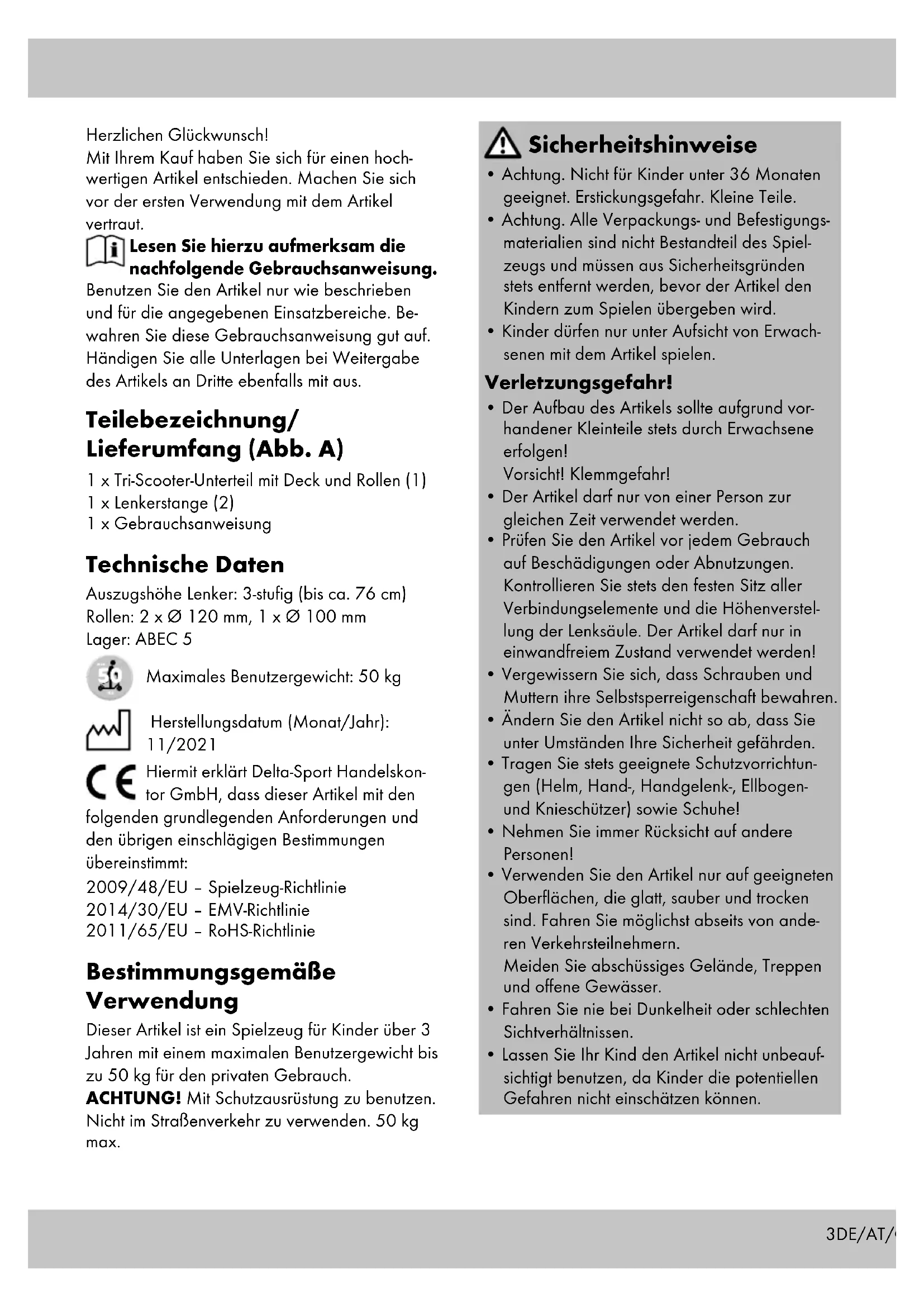C3DE/AT/CH Herzlichen Glückwunsch! Mit Ihrem Kauf haben Sie sich für einen hoch- wertigen Artikel entschieden. Machen Sie sich vor der ersten Verwendung mit dem Artikel vertraut. Lesen Sie hierzu aufmerksam die nachfolgende Gebrauchsanweisung. Benutzen Sie den Artikel nur wie beschrieben und für die angegebenen Einsatzbereiche. Be- wahren Sie diese Gebrauchsanweisung gut auf. Händigen Sie alle Unterlagen bei Weitergabe des Artikels an Dritte ebenfalls mit aus. Teilebezeichnung/ Lieferumfang (Abb. A) 1 x Tri-Scooter-Unterteil mit Deck und Rollen (1) 1 x Lenkerstange (2) 1 x Gebrauchsanweisung Technische Daten Auszugshöhe Lenker: 3-stufig (bis ca. 76 cm) Rollen: 2 x Ø 120 mm, 1 x Ø 100 mm Lager: ABEC 5 Maximales Benutzergewicht: 50 kg Herstellungsdatum (Monat/Jahr): 11/2021 Hiermit erklärt Delta-Sport Handelskon- tor GmbH, dass dieser Artikel mit den folgenden grundlegenden Anforderungen und den übrigen einschlägigen Bestimmungen übereinstimmt: 2009/48/EU – Spielzeug-Richtlinie 2014/30/EU – EMV-Richtlinie 2011/65/EU – RoHS-Richtlinie Bestimmungsgemäße Verwendung Dieser Artikel ist ein Spielzeug für Kinder über 3 Jahren mit einem maximalen Benutzergewicht bis zu 50 kg für den privaten Gebrauch. ACHTUNG! Mit Schutzausrüstung zu benutzen. Nicht im Straßenverkehr zu verwenden. 50 kg max. Sicherheitshinweise