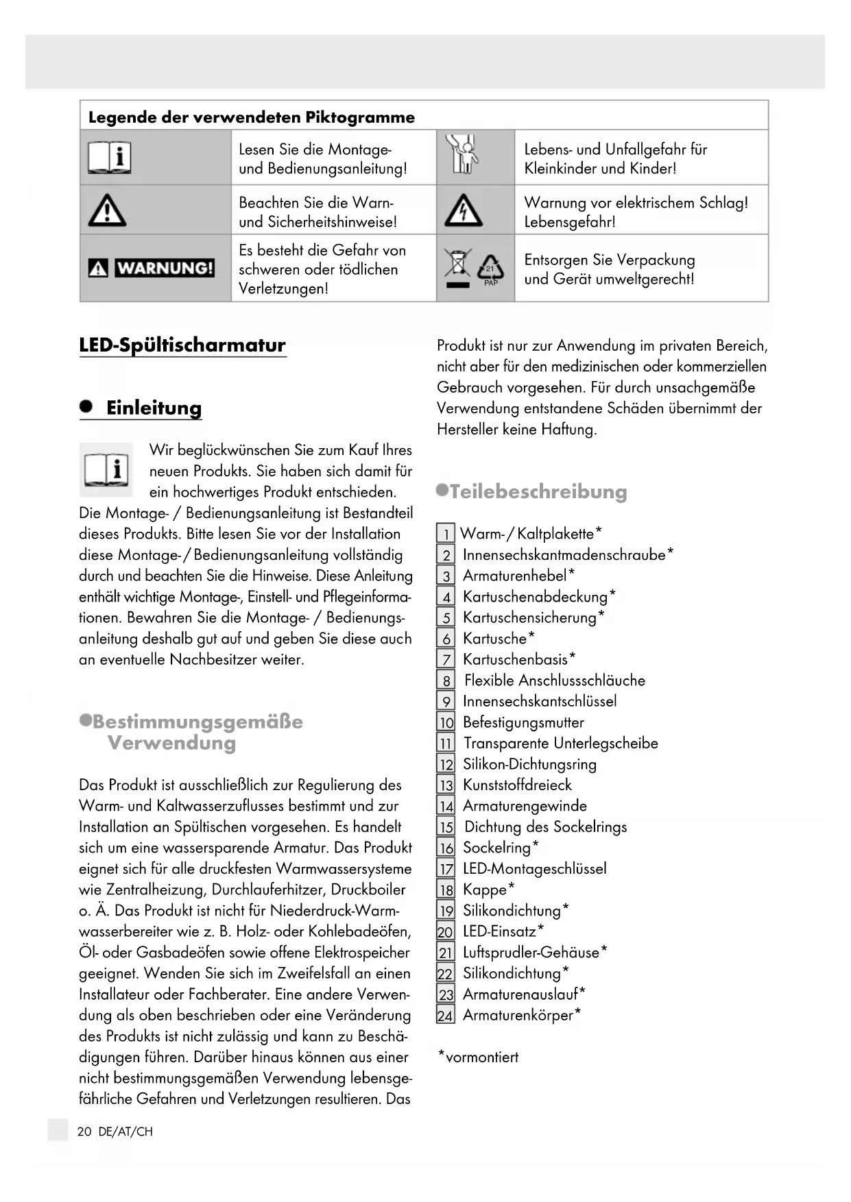 PAP Entsorgen Sie Verpackung und Gerät umweltgerecht! LED-Spültischarmatur Einleitung Wir beglückwünschen Sie zum Kauf Ihres neuen Produkts. Sie haben sich damit für ein hochwertiges Produkt entschieden. Die Montage- / Bedienungsanleitung ist Bestandteil dieses Produkts. Bitte lesen Sie vor der Installation diese Montage- / Bedienungsanleitung vollständig durch und beachten Sie die Hinweise. Diese Anleitu