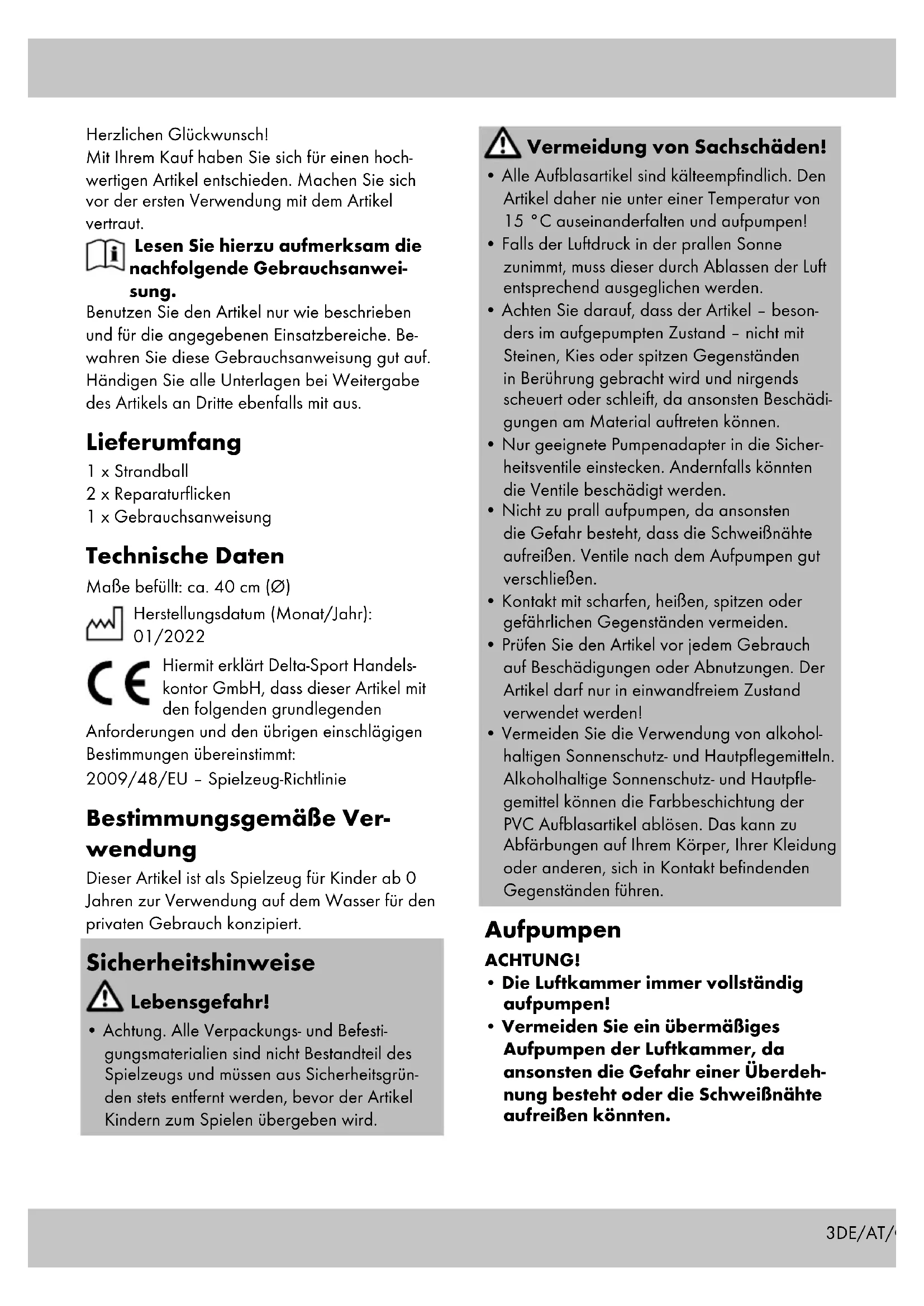 A3DE/AT/CH Herzlichen Glückwunsch! Mit Ihrem Kauf haben Sie sich für einen hoch- wertigen Artikel entschieden. Machen Sie sich vor der ersten Verwendung mit dem Artikel vertraut. Lesen Sie hierzu aufmerksam die nachfolgende Gebrauchsanwei- sung. Benutzen Sie den Artikel nur wie beschrieben und für die angegebenen Einsatzbereiche. Be- wahren Sie diese Gebrauchsanweisung gut auf. Händigen Sie alle Unterlagen bei Weitergabe des Artikels an Dritte ebenfalls mit aus. Lieferumfang 1 x Strandball 2 x Reparaturflicken 1 x Gebrauchsanweisung Technische Daten Maße befüllt: ca. 40 cm (Ø) Herstellungsdatum (Monat/Jahr): 01/2022 Hiermit erklärt Delta-Sport Handels- kontor GmbH, dass dieser Artikel mit den folgenden grundlegenden Anforderungen und den übrigen einschlägigen Bestimmungen übereinstimmt: 2009/48/EU – Spielzeug-Richtlinie Bestimmungsgemäße Ver- wendung Dieser Artikel ist als Spielzeug für Kinder ab 0 Jahren zur Verwendung auf dem Wasser für den privaten Gebrauch konzipiert. Sicherheitshinweise Lebensgefahr!