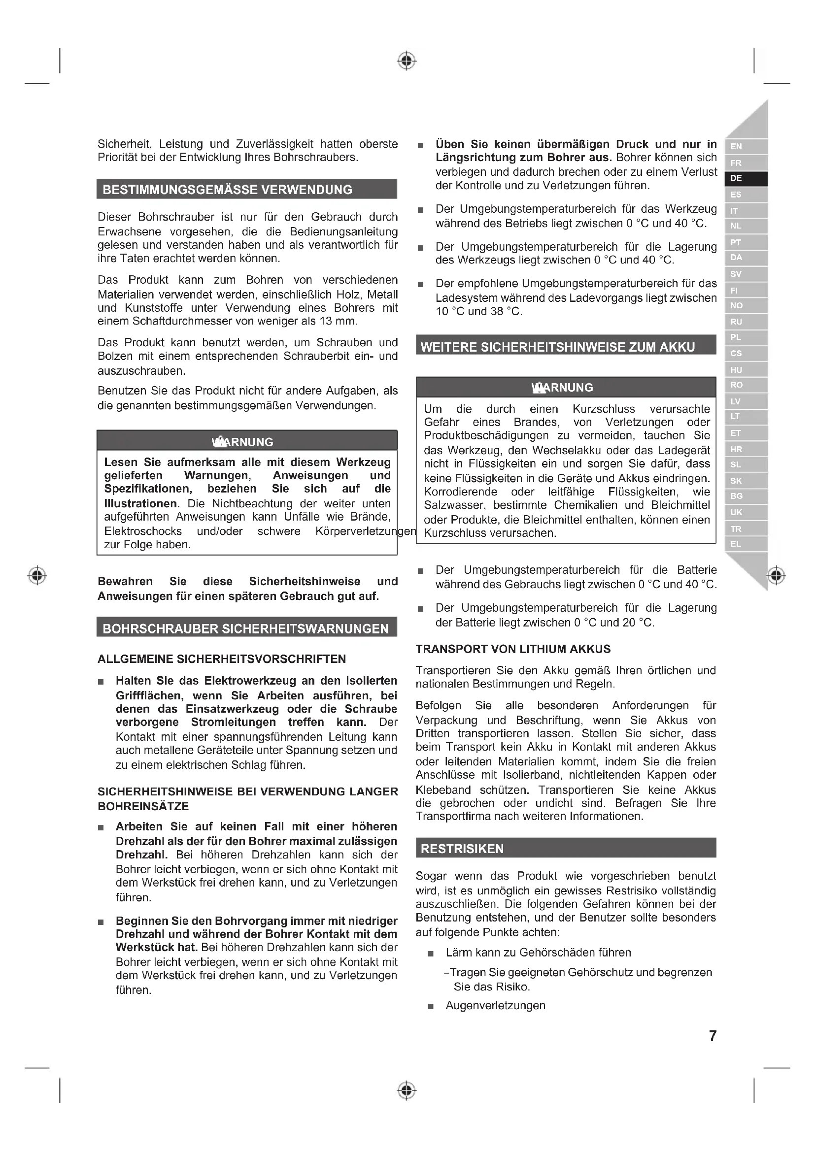 Dieser Bohrschrauber ist nur für den Gebrauch durch Erwachsene vorgesehen, die die Bedienungsanleitung gelesen und verstanden haben und als verantwortlich für ihre Taten erachtet werden können. Das Produkt kann zum Bohren von verschiedenen Materialien verwendet werden, einschließlich Holz, Metall und Kunststoffe unter Verwendung eines Bohrers mit einem Schaftdurchmesser von weniger als 13 mm. Das Produkt kann benutzt werden, um Schrauben und Bolzen mit einem entsprechenden Schrauberbit ein- und auszuschrauben. Benutzen Sie das Produkt nicht für andere Aufgaben, als die genannten bestimmungsgemäßen Verwendungen. WARNUNG Lesen Sie aufmerksam alle mit diesem Werkzeug gelieferten Warnungen, Anweisungen und Spezifikationen, beziehen Sie sich auf die Illustrationen. Die Nichtbeachtung der weiter unten aufgeführten Anweisungen kann Unfälle wie Brände,