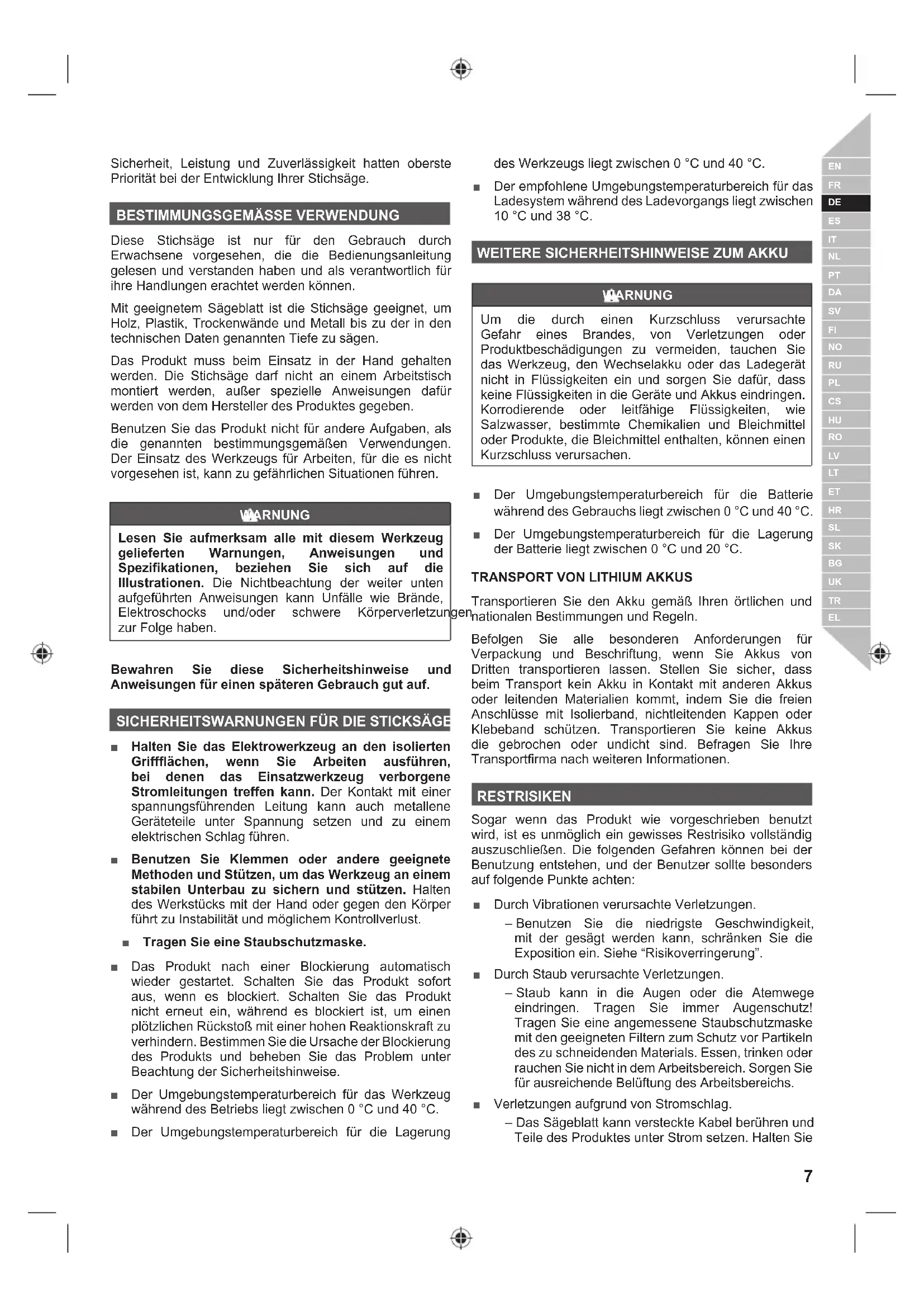 RESTRISIKEN Sogar wenn das Produkt wie vorgeschrieben benutzt wird, ist es unmöglich ein gewisses Restrisiko vollständig auszuschließen. Die folgenden Gefahren können bei der Benutzung entstehen, und der Benutzer sollte besonders auf folgende Punkte achten: Ŷ Durch Vibrationen verursachte Verletzungen. – Benutzen Sie die niedrigste Geschwindigkeit, mit der gesägt werden kann, schränken Sie die Exposition ein. Siehe “Risikoverringerung”. Ŷ Durch Staub verursachte Verletzungen. – Staub kann in die Augen oder die Atemwege eindringen. Tragen Sie immer Augenschutz! Tragen Sie eine angemessene Staubschutzmaske mit den geeigneten Filtern zum Schutz vor Partikeln des zu schneidenden Materials. Essen, trinken oder rauchen Sie nicht in dem Arbeitsbereich. Sorgen Sie für ausreichende Belüftung des Arbeitsbereichs. Ŷ Verletzungen aufgrund von Stromschlag. – Das Sägeblatt kann versteckte Kabel berühren und Teile des Produktes unter Strom setzen. Halten Sie8 | Deutsch das Produkt immer an den vorgesehenen Griffen und seien Sie vorsichtig, wenn Sie in Wänden oder Böden sägen, wo Sie möglicherweise versteckte Kabel nicht sehen können. Ŷ Durch Kontakt mit dem Sägeblatt verursachte Verletzung – Die Sägeblätter sind sehr scharf und werden bei Benutzung heiß. Tragen Sie Handschuhe beim Wechseln von Sägeblättern. Halten Sie Ihre Hände immer von dem Sägebereich fern. Klemmen Sie das Werkstück, wann immer möglich, fest. Ŷ Lärm kann zu Gehörschäden führen – Lärm kann zu Gehörschäden führen Tragen Sie einen Gehörschutz, wenn Sie Elektrowerkzeug für längere Zeit benutzen. RISIKOVERRINGERUNG Vibrationen von in der Hand gehaltenen Werkzeugen können bei einigen Personen zu einem Zustand, der Raynaud-Syndrom genannt wird, führen. Symptome sind u.a. Kribbeln, Taubheitsgefühl und episodische Weißfärbung der Finger und treten normalerweise bei Kälte auf. Man geht davon aus, dass ererbte Faktoren, Kälte und Feuchtigkeit, Essgewohnheiten, Rauchen und Arbeitsweise zur Entwicklung dieser Symptome beitragen. Der Anwender kann Maßnahmen ergreifen, um die Auswirkungen der Vibrationen möglicherweise zu verringern: Ŷ Halten Sie den Körper bei Kälte warm. Tragen Sie beim Betrieb des Geräts Handschuhe, um Hände und Handgelenke warm zu halten. Berichten zu Folge ist kaltes Wetter ein wesentlicher Faktor, der zum Raynaud Syndrom beiträgt. Ŷ Betätigen Sie sich nach jedem Einsatz körperlich, um den Blutkreislauf zu steigern. Ŷ Machen Sie regelmäßig Pausen. Beschränken Sie die Beanspruchung pro Tag. Sollten bei Ihnen Symptome dieses Zustands auftreten, stellen Sie unverzüglich den Betrieb ein und suchen Sie in Hinsicht auf die Symptome einen Arzt auf. WARNUNG Verletzungen können durch lange Benutzung eines Werkzeugs entstehen oder verschlimmert werden. Machen Sie regelmäßig Pause, wenn Sie ein Werkzeug für lange Zeit benutzen.
