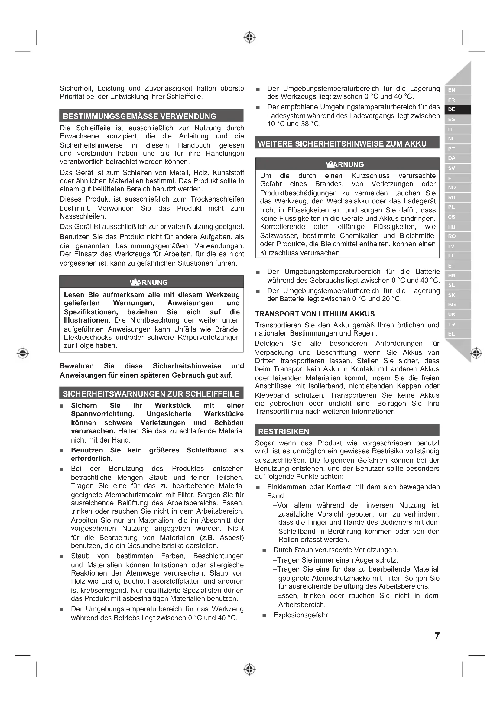 Transportieren Sie den Akku gemäß Ihren örtlichen und nationalen Bestimmungen und Regeln. Befolgen Sie alle besonderen Anforderungen für Verpackung und Beschriftung, wenn Sie Akkus von Dritten transportieren lassen. Stellen Sie sicher, dass beim Transport kein Akku in Kontakt mit anderen Akkus oder leitenden Materialien kommt, indem Sie die freien Anschlüsse mit Isolierband, nichtleitenden Kappen oder Klebeband schützen. Transportieren Sie keine Akkus die gebrochen oder undicht sind. Befragen Sie Ihre Transportfi rma nach weiteren Informationen. RESTRISIKEN Sogar wenn das Produkt wie vorgeschrieben benutzt wird, ist es unmöglich ein gewisses Restrisiko vollständig auszuschließen. Die folgenden Gefahren können bei der Benutzung entstehen, und der Benutzer sollte besonders auf folgende Punkte achten: ■ Einklemmen oder Kontakt mit dem sich bewegenden Band – Vor allem während der inversen Nutzung ist zusätzliche Vorsicht geboten, um zu verhindern, dass die Finger und Hände des Bedieners mit dem Schleifband in Berührung kommen oder von den Rollen erfasst werden. ■ Durch Staub verursachte Verletzungen. – Tragen Sie immer einen Augenschutz. – Tragen Sie eine für das zu bearbeitende Material geeignete Atemschutzmaske mit Filter. Sorgen Sie für ausreichende Belüftung des Arbeitsbereichs. – Essen, trinken oder rauchen Sie nicht in dem Arbeitsbereich. ■ Explosionsgefahr8 | Deutsch – Die Ansammlung von feinem Staub kann sich entzünden und ein Feuer verursachen. Halten Sie den Arbeitsbereich sauber und frei von Staub. Systeme zur Staubsammlung und Absaugung sollten regelmäßig und gründlich gereinigt werden. Beim Schleifen von Metall können heiße Funken entstehen. ■ Lärm und Vibration – Tragen Sie einen Gehörschutz, wenn Sie das Produkt benutzen. Benutzen Sie das Produkt nicht über lange Zeiträume. RISIKOVERRINGERUNG Vibrationen von in der Hand gehaltenen Werkzeugen können bei einigen Personen zu einem Zustand, der Raynaud-Syndrom genannt wird, führen. Symptome sind u.a. Kribbeln, Taubheitsgefühl und episodische Weißfärbung der Finger und treten normalerweise bei Kälte auf. Man geht davon aus, dass ererbte Faktoren, Kälte und Feuchtigkeit, Essgewohnheiten, Rauchen und Arbeitsweise zur Entwicklung dieser Symptome beitragen. Der Anwender kann Maßnahmen ergreifen, um die Auswirkungen der Vibrationen möglicherweise zu verringern: ■ Halten Sie den Körper bei Kälte warm. Tragen Sie beim Betrieb des Geräts Handschuhe, um Hände und Handgelenke warm zu halten. Berichten zu Folge ist kaltes Wetter ein wesentlicher Faktor, der zum Raynaud Syndrom beiträgt. ■ Betätigen Sie sich nach jedem Einsatz körperlich, um den Blutkreislauf zu steigern. ■ Machen Sie regelmäßig Pausen. Beschränken Sie die Beanspruchung pro Tag. Sollten bei Ihnen eines der zuvor beschriebenen Symptome / Zustände auftreten, stellen Sie unverzüglich den Betrieb ein und suchen Sie bezüglich der Symptome einen Arzt auf. WARNUNG Verletzungen können durch lange Benutzung eines Werkzeugs entstehen oder verschlimmert werden. Machen Sie regelmäßig Pause, wenn Sie ein Werkzeug für lange Zeit benutzen.