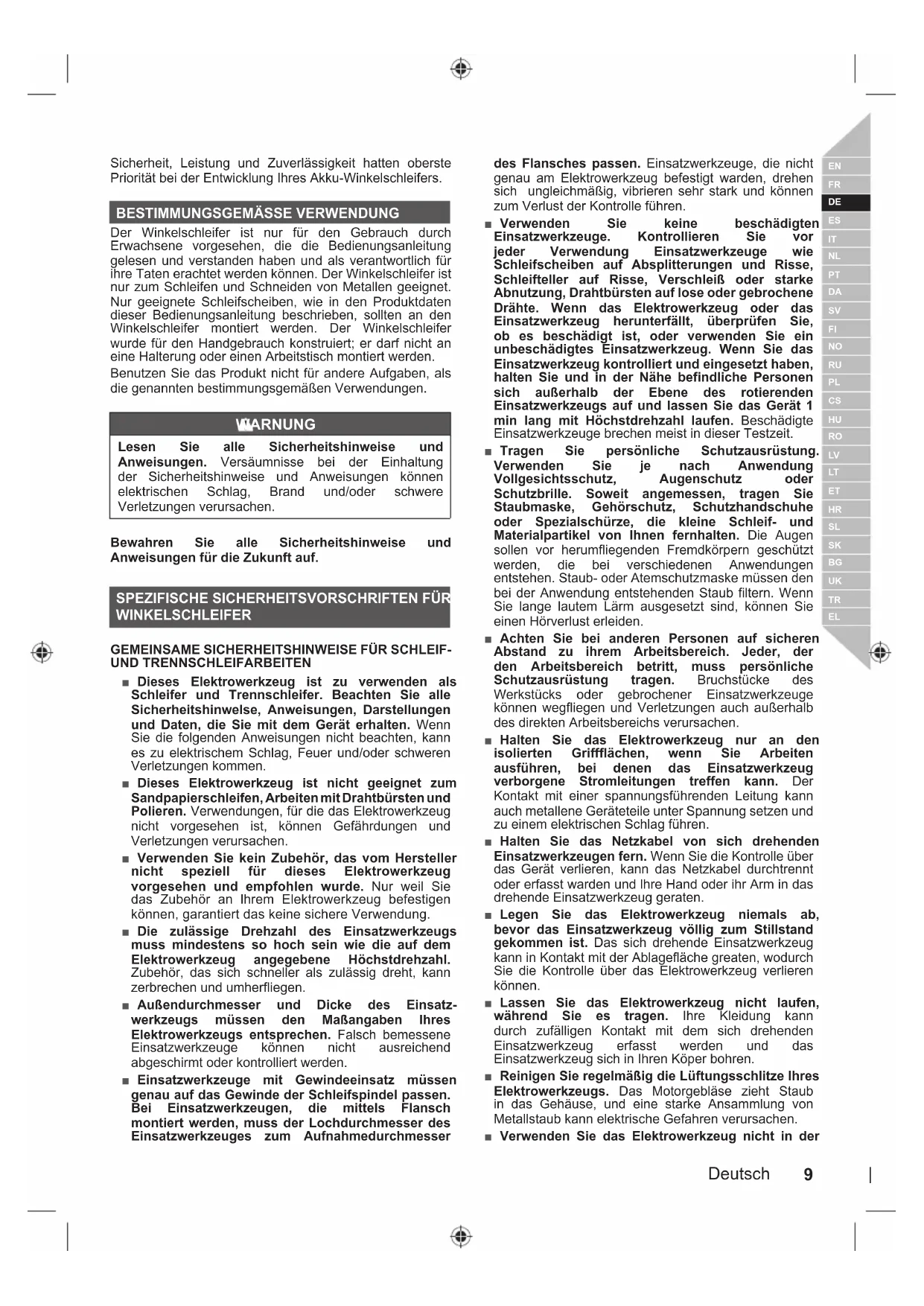 UND TRENNSCHLEIFARBEITEN ■ Dieses Elektrowerkzeug ist zu verwenden als Schleifer und Trennschleifer. Beachten Sie alle Sicherheitshinwelse, Anweisungen, Darstellungen und Daten, die Sie mit dem Gerät erhalten. Wenn Sie die folgenden Anweisungen nicht beachten, kann es zu elektrischem Schlag, Feuer und/oder schweren Verletzungen kommen. ■ Dieses Elektrowerkzeug ist nicht geeignet zum Sandpapierschleifen, Arbeiten mit Drahtbürsten und Polieren. Verwendungen, für die das Elektrowerkzeug nicht vorgesehen ist, können Gefährdungen und Verletzungen verursachen. ■ Verwenden Sie kein Zubehör, das vom Hersteller nicht speziell für dieses Elektrowerkzeug vorgesehen und empfohlen wurde. Nur weil Sie das Zubehör an lhrem Elektrowerkzeug befestigen können, garantiert das keine sichere Verwendung. ■ Die zulässige Drehzahl des Einsatzwerkzeugs muss mindestens so hoch sein wie die auf dem Elektrowerkzeug angegebene Höchstdrehzahl. Zubehör, das sich schneller als zulässig dreht, kann zerbrechen und umherfliegen. ■ Außendurchmesser und Dicke des Einsatz- werkzeugs müssen den Maßangaben Ihres Elektrowerkzeugs entsprechen. Falsch bemessene Einsatzwerkzeuge können nicht ausreichend abgeschirmt oder kontrolliert werden. ■ Einsatzwerkzeuge mit Gewindeeinsatz müssen genau auf das Gewinde der Schleifspindel passen. Bei Einsatzwerkzeugen, die mittels Flansch montiert werden, muss der Lochdurchmesser des Einsatzwerkzeuges zum Aufnahmedurchmesser des Flansches passen. Einsatzwerkzeuge, die nicht genau am Elektrowerkzeug befestigt warden, drehen sich ungleichmäßig, vibrieren sehr stark und können zum Verlust der Kontrolle führen. ■ Verwenden Sie keine beschädigten Einsatzwerkzeuge. Kontrollieren Sie vor jeder Verwendung Einsatzwerkzeuge wie Schleifscheiben auf Absplitterungen und Risse, Schleifteller auf Risse, Verschleiß oder starke Abnutzung, Drahtbürsten auf lose oder gebrochene Drähte. Wenn das Elektrowerkzeug oder das Einsatzwerkzeug herunterfällt, überprüfen Sie, ob es beschädigt ist, oder verwenden Sie ein unbeschädigtes Einsatzwerkzeug. Wenn Sie das Einsatzwerkzeug kontrolliert und eingesetzt haben, halten Sie und in der Nähe befindliche Personen sich außerhalb der Ebene des rotierenden Einsatzwerkzeugs auf und lassen Sie das Gerät 1 min lang mit Höchstdrehzahl laufen. Beschädigte Einsatzwerkzeuge brechen meist in dieser Testzeit. ■ Tragen Sie persönliche Schutzausrüstung. Verwenden Sie je nach Anwendung Vollgesichtsschutz, Augenschutz oder Schutzbrille. Soweit angemessen, tragen Sie Staubmaske, Gehörschutz, Schutzhandschuhe oder Spezialschürze, die kleine Schleif- und Materialpartikel von Ihnen fernhalten. Die Augen sollen vor herumfliegenden Fremdkörpern geschützt werden, die bei verschiedenen Anwendungen entstehen. Staub- oder Atemschutzmaske müssen den bei der Anwendung entstehenden Staub filtern. Wenn Sie lange lautem Lärm ausgesetzt sind, können Sie einen Hörverlust erleiden. ■ Achten Sie bei anderen Personen auf sicheren Abstand zu ihrem Arbeitsbereich. Jeder, der den Arbeitsbereich betritt, muss persönliche Schutzausrüstung tragen. Bruchstücke des Werkstücks oder gebrochener Einsatzwerkzeuge können wegfliegen und Verletzungen auch außerhalb des direkten Arbeitsbereichs verursachen. ■ Halten Sie das Elektrowerkzeug nur an den isolierten Griffflächen, wenn Sie Arbeiten ausführen, bei denen das Einsatzwerkzeug verborgene Stromleitungen treffen kann. Der Kontakt mit einer spannungsführenden Leitung kann auch metallene Geräteteile unter Spannung setzen und zu einem elektrischen Schlag führen. ■ Halten Sie das Netzkabel von sich drehenden Einsatzwerkzeugen fern. Wenn Sie die Kontrolle über das Gerät verlieren, kann das Netzkabel durchtrennt oder erfasst warden und lhre Hand oder ihr Arm in das drehende Einsatzwerkzeug geraten. ■ Legen Sie das Elektrowerkzeug niemals ab, bevor das Einsatzwerkzeug völlig zum Stillstand gekommen ist. Das sich drehende Einsatzwerkzeug kann in Kontakt mit der Ablagefläche greaten, wodurch Sie die Kontrolle über das Elektrowerkzeug verlieren können. ■ Lassen Sie das Elektrowerkzeug nicht laufen, während Sie es tragen. Ihre Kleidung kann durch zufälligen Kontakt mit dem sich drehenden Einsatzwerkzeug erfasst werden und das Einsatzwerkzeug sich in Ihren Köper bohren. ■ Reinigen Sie regelmäßig die Lüftungsschlitze Ihres Elektrowerkzeugs. Das Motorgebläse zieht Staub in das Gehäuse, und eine starke Ansammlung von Metallstaub kann elektrische Gefahren verursachen. ■ Verwenden Sie das Elektrowerkzeug nicht in der| Deutsch10 Nähe brennbarer Materialien. Funken können diese Materialien entzünden. ■ Verwenden Sie keine Einsatzwerkzeuge, die flüssige Kühlmittel erfordern. Die Verwendung von Wasser oder anderen flüssigen Kühlmitteln kann zu einem elektrischen Schlag führen.