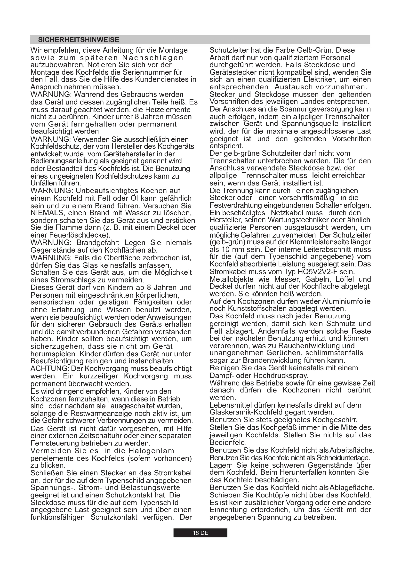 Voordat u gaat demonteren of schoonmaken dient u de stroomvoorziening af te sluiten door de stekker uit het stopcontact te halen of de stroomtoevoer via de zekering af te sluiten. Zorg ervoor dat het apparaat volledig is afgekoeld.Reinig de geëmailleerde, verchroomde en geverfde delen methandwarm water en met een niet agressieve allesreiniger. Gebruik voor de roestvrijstalen delen een rvs reiniger die gewoon in de winkel verkrijgbaar is. Aluminium kunt u het beste reinigen door eerst met een met olie doordrenkte doek te poetsen en dit vervolgens met een alcoholhoudendmiddel af te nemen. Gebruik tijdens het schoonmaken nooit: schuurmiddelen, bijtende schoonmaakmiddelen, bleekmiddel of zuren. Voorkom dat er op de geëmaillerde, roestvrijstalen of geverfde delen zuren blijven liggen (azijn, citroensap etc.)De brandervoet kunt u reinigen met water en allesreinger. Als u de oorspronkelijke glans terug wilt krijgen, kunt u een speciaal schoonmaakmiddel voor aluminiumlegeringen gebruiken. De branderdeksel, gemaakt van staal met emaille, kunt u reinigen in warm water met reinigingsmiddel. U dient alle aangekoekte deeltjes te verwijderen die onregelmatigheid in de vlam kunnen veroorzaken. Na het reinigen moeten brandervoet en branderdeksel goed worden gedroogd. Let hierbij op de de buisjes in de brandervoet. Zet daarna de branders zorgvuldig op hun plaats.LET OP: Zorg er voor dat na het schoonmaken de branders op de juiste plaats zitten en dat goed op dehet branderdeksel brandervoet zit. Dit om een slecht vlambeeld en schade aan de brandervoet te voorkomen. Het wordt aanbevolen om alles wat kan smelten zoals plastiek, suiker of producten met een hoog suikergehalte weg te houden van de kookplaat.- Neem een paar druppels van een specifiek reinigingsmiddel voorglazen oppervlakken- Wrijf met kracht op de vervuilde onderdelen, indien mogelijk , met eenzachte doek of een licht vochtige papieren doek-Droog met een zachte doek of keukenpapier totdat het oppervlakschoon is. Indien erna nog steeds vlekken blijven:- neem opnieuw een doek met een paar druppels glasreiniger - verwijder de vlekken met een schraper in een hoek van 30 ° tot er geen hardnekkige vlekken meer zijn- Veeg met een zachte doek of keukenpapier droog totdat het oppervlakschoon is- Herhaal indien nodig het gebruik van het scheermes of schraper kanhet oppervlak niet beschadigen indien een hoek van 30 ° wordtgerespecteerd. Hou het mes buiten het bereik van kinderen. Tips: Regelmatig reinigen is van essentieel belang om een beschermlaag te laten die krassen en slijtage voorkomt. Zorg ervoordat het oppervlak schoon is voordat u de kookplaat opnieuw gebruikt. Om sporen van water en kalksteen te verwijderen, wacht tot de plaat is afgekoeld en gebruik een paar druppels witte azijn of citroensap. Veeg tenslotte de druppels en een paarweg met een papieren doek druppels van het specifieke product.1DE8 Wir empfehlen, diese Anleitung für die Montage sowie zum späteren Nachschlagen aufzubewahren. Notieren Sie sich vor der Montage des Kochfelds die Seriennummer für den Fall, dass Sie die Hilfe des Kundendienstes in Anspruch nehmen müssen. WARNUNG: Während des Gebrauchs werden das Gerät und dessen zugänglichen Teile heiß. Es muss darauf geachtet werden, die Heizelemente nicht zu berühren. Kinder unter 8 Jahren müssen vom Gerät ferngehalten oder permanent beaufsichtigt werden. WARNUNG: Verwenden Sie ausschließlich einen Kochfeldschutz, der vom Hersteller des Kochgeräts entwickelt wurde, vom Gerätehersteller in der Bedienungsanleitung als geeignet genannt wird oder Bestandteil des Kochfelds ist. Die Benutzung eines ungeeigneten Kochfeldschutzes kann zu Unfällen führen. WARNUNG: Unbeaufsichtigtes Kochen auf einem Kochfeld mit Fett oder Öl kann gefährlich sein und zu einem Brand führen. Versuchen Sie NIEMALS, einen Brand mit Wasser zu löschen, sondern schalten Sie das Gerät aus und ersticken Sie die Flamme dann (z. B. mit einem Deckel oder einer Feuerlöschdecke). WARNUNG: Brandgefahr: Legen Sie niemals Gegenstände auf den Kochflächen ab. WARNUNG: Falls die Oberfläche zerbrochen ist, dürfen Sie das Glas keinesfalls anfassen. Schalten Sie das Gerät aus, um die Möglichkeit eines Stromschlags zu vermeiden. Dieses Gerät darf von Kindern ab 8 Jahren und Personen mit eingeschränkten körperlichen, sensorischen oder geistigen Fähigkeiten oder ohne Erfahrung und Wissen benutzt werden, wenn sie beaufsichtigt werden oder Anweisungen für den sicheren Gebrauch des Geräts erhalten und die damit verbundenen Gefahren verstanden haben. Kinder sollten beaufsichtigt werden, um sicherzugehen, dass sie nicht am Gerät herumspielen. Kinder dürfen das Gerät nur unter Beaufsichtigung reinigen und instandhalten. ACHTUNG: Der Kochvorgang muss beaufsichtigt werden. Ein kurzzeitiger Kochvorgang muss permanent überwacht werden. Es wird dringend empfohlen, Kinder von den Kochzonen fernzuhalten, wenn diese in Betrieb sind oder nachdem sie ausgeschaltet wurden, solange die Restwärmeanzeige noch aktiv ist, um die Gefahr schwerer Verbrennungen zu vermeiden. Das Gerät ist nicht dafür vorgesehen, mit Hilfe einer externen Zeitschaltuhr oder einer separaten Fernsteuerung betrieben zu werden. Vermeiden Sie es, in die Halogenlam penelemente des Kochfelds (sofern vorhanden) zu blicken. Schließen Sie einen Stecker an das Stromkabel an, der für die auf dem Typenschild angegebenen Spannungs-, Strom- und Belastungswerte geeignet ist und einen Schutzkontakt hat. Die Steckdose muss für die auf dem Typenschild angegebene Last geeignet sein und über einen funktionsfähigen Schutzkontakt verfügen. Der SICHERHEITSHINWEISE Schutzleiter hat die Farbe Gelb-Grün. Diese Arbeit darf nur von qualifiziertem Personal durchgeführt werden. Falls Steckdose und Gerätestecker nicht kompatibel sind, wenden Sie sich an einen qualifizierten Elektriker, um einen entsprechenden Austausch vorzunehmen. Stecker und Steckdose müssen den geltenden Vorschriften des jeweiligen Lande