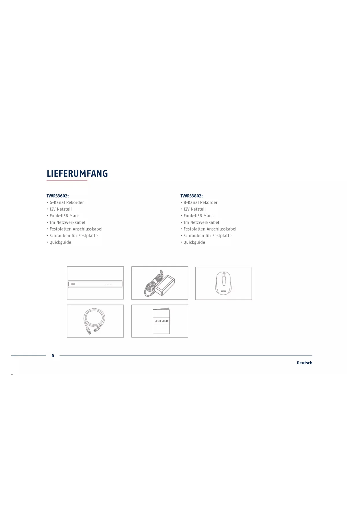 - Quickguide Quick Guide7 Deutsch WARNHINWEISE Betreiben und lagern Sie den Rekorder nur unter den vom Hersteller empfohlenen Umgebungsbedingungen. Achten Sie darauf, dass immer eine ausreichende Belüung vorhanden ist. Achten Sie auf eine unterbrechungs- freie Stromversorgung. Halten Sie starke Magnetfelder vom Rekorder fern. Halten Sie Flüssigkeiten vom Rekorder fern. Schalten Sie den Rekorder aus, bevor Sie Peripheriegeräte anschließen oder entfernen.8 Deutsch ANSCHLÜSSE Daten LED Anzeige der momentanen HDD Aktivität Power LED Anzeige der Betriebsbereitscha Netzwerk LED Anzeige der momentanen Netzwerk Aktivität9 Deutsch Video IN BNC-Eingang für analoge Kameras Unterstützt das TVI, AHD, CVI und CVBS Format VGA VGA Monitoranschluss HDMI HDMI Monitoranschluss USB Anschluss für USB-Geräte LAN RJ45-Anschluss für eine Netzwerkverbindung 12V 12V DC Stromanschluss10 Deutsch