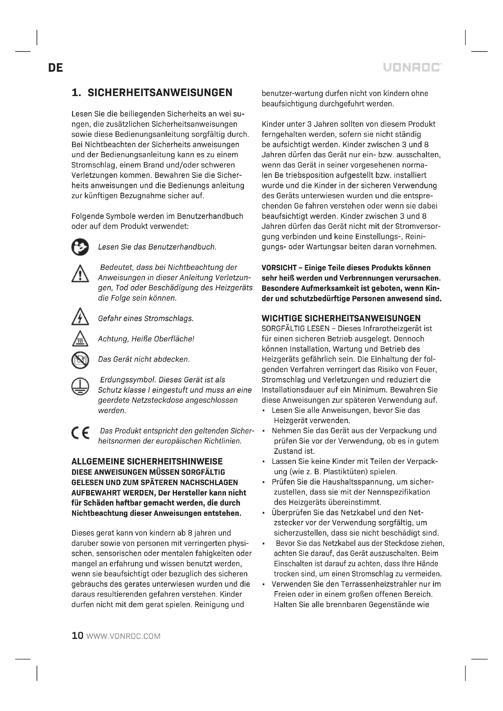 Lesen Sie die beiliegenden Sicherheits an wei su- ngen, die zusätzlichen Sicherheitsanweisungen sowie diese Bedienungsanleitung sorgfältig durch. Bei Nichtbeachten der Sicherheits anweisungen und der Bedienungsanleitung kann es zu einem Stromschlag, einem Brand und/oder schweren Verletzungen kommen. Bewahren Sie die Sicher- heits anweisungen und die Bedienungs anleitung zur künftigen Bezugnahme sicher auf. Folgende Symbole werden im Benutzerhandbuch oder auf dem Produkt verwendet: Lesen Sie das Benutzerhandbuch. Bedeutet, dass bei Nichtbeachtung der Anweisungen in dieser Anleitung Verletzun- gen, Tod oder Beschädigung des Heizgeräts die Folge sein können. Gefahr eines Stromschlags. Achtung, Heiße Oberfläche! Das Gerät nicht abdecken. Erdungssymbol. Dieses Gerät ist als Schutz klasse I eingestuft und muss an eine geerdete Netzsteckdose angeschlossen werden. Das Produkt entspricht den geltenden Sicher- heitsnormen der europäischen Richtlinien. ALLGEMEINE SICHERHEITSHINWEISE