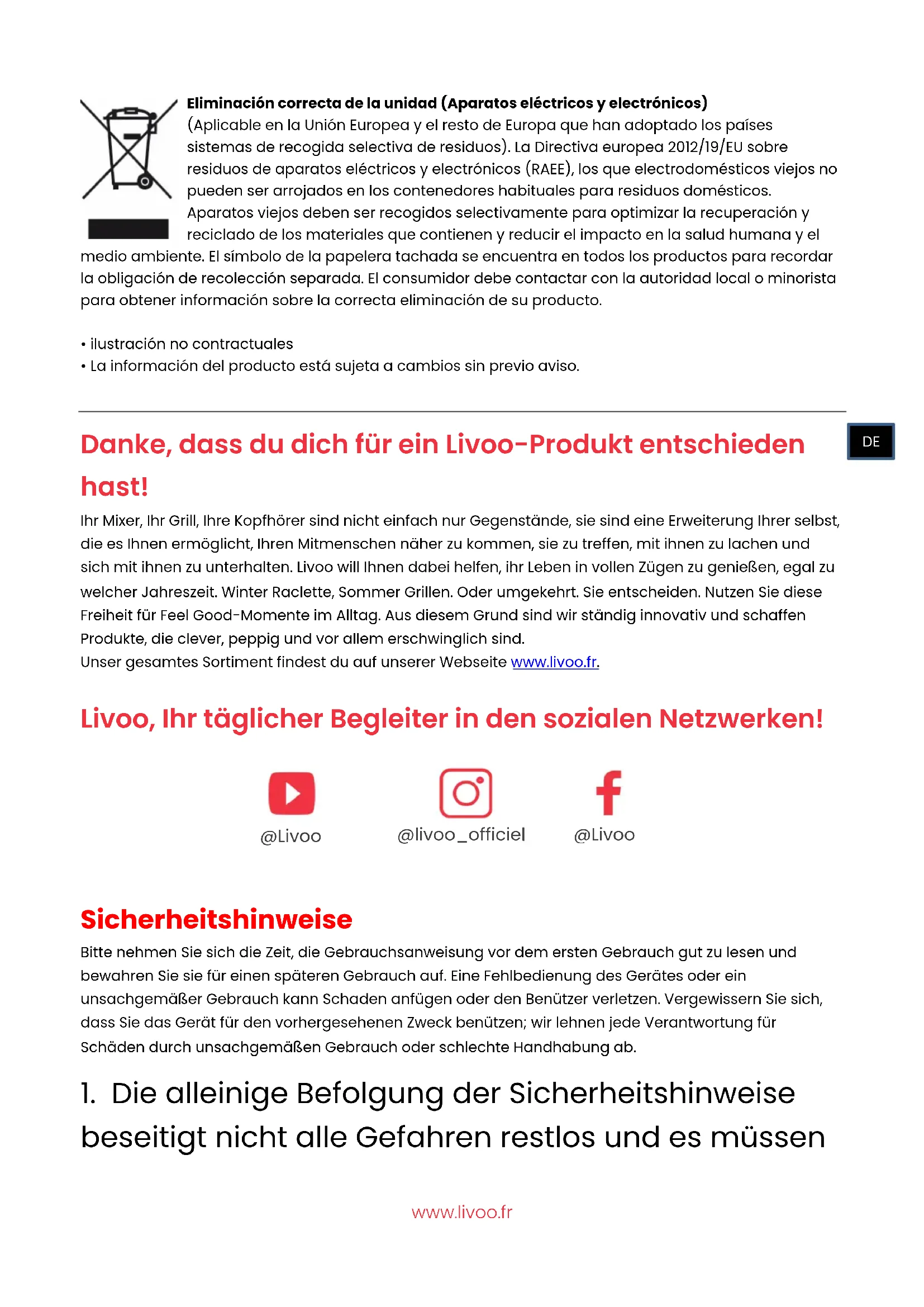 - La información del producto está sujeta a cambios sin previo aviso. Danke, dass du dich für ein Livoo-Produkt entschieden hast! Ihr Mixer, Ihr Grill, Ihre Kopfhörer sind nicht einfach nur Gegenstände, sie sind eine Erweiterung Ihrer selbst, die es Ihnen ermöglicht, Ihren Mitmenschen näher zu kommen, sie zu treffen, mit ihnen zu lachen und sich mit ihnen zu unterhalten. Livoo will Ihnen dabei helfen, ihr Leben in vollen Zügen zu genießen, egal zu welcher Jahreszeit. Winter Raclette, Sommer Grillen. Oder umgekehrt. Sie entscheiden. Nutzen Sie diese Freiheit für Feel Good-Momente im Alltag. Aus diesem Grund sind wir ständig innovativ und schaffen Produkte, die clever, peppig und vor allem erschwinglich sind. Unser gesamtes Sortiment findest du auf unserer Webseite www.livoo.fr. Livoo, Ihr täglicher Begleiter in den sozialen Netzwerken!