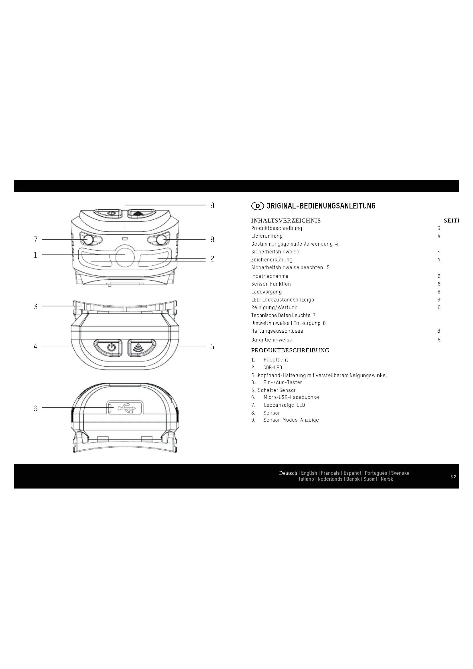 § Das Produkt dient als mobile Kopfleuchte § Die Leuchte ist nicht zur Verwendung in anderen Anwendungen bestimmt § Nicht für die Raumbeleuchtung im Haushalt geeignet § Das Produkt ist nicht für den kommerziellen Gebrauch bestimmt SICHERHEITSHINWEISE Diese Bedienungsanleitung enthält wichtige Informationen zur Benutzung und Inbetriebnahme für folgendes Produkt: Sensor-Headlight, in weiterem Text nur Leuchte bzw. Produkt genannt. Lesen Sie vor der ersten Benutzung Ihrer Leuchte sorgfältig diese Betriebsanlei- tung und handeln Sie danach. Bewahren Sie diese Betriebsanleitung für späteren Gebrauch oder für Nachbesitzer auf. Bei Nichtbeachtung der Bedienungsanleitung und der Sicherheitshinweise können Schäden am Produkt und Gefahren (Verletzungen) für den Bediener und andere Personen entstehen. Die Bedienungsanleitung bezieht sich auf gültige Normen und Regeln der Europäischen Union. Hierzu bitte auch die im Ausland landesspezifischen Gesetze und Richtlinien beachten. ZEICHENERKLÄRUNG Bitte beachten Sie folgende Zeichen und Wörter, welche Sie in der Bedienungsan- leitung, auf dem Produkt und auf der Verpackung verwendet werden. Information Nützliche Zusatz-Informationen zum Produkt Hinweis Dieser Hinweis warnt vor möglichen Schäden aller Art Warnung Achtung – Gefährdung! Kann zu schweren Verletzungen oder zum Tod führen SICHERHEITSHINWEISE BEACHTEN! Augenverletzungen vermeiden - Nie direkt in den Lichtstrahl schauen oder anderen Personen ins Gesicht leuchten. Geschieht dies zu lange, kann durch Blaulichtantei- le eine Netzhautgefährdung auftreten. Falls ein Lichtstrahl in die Augen trifft, sind die Augen zu schließen und der Kopf sollte von dem Lichtstrahl abgewendet werden. Diese Lampe überschreitet die Bedingungen der risikofreien Nutzung. Das Risiko bei der Verwendung hängt davon ab, wie der Nutzer mit der Lampe umgeht. § Produkt nicht öffnen oder modifizieren! Instandsetzungsarbeiten sowie Akkupack- wechsel dürfen nur vom Hersteller oder einem von ihm beauftragten Servicetechni- ker oder einer vergleichbar qualifizierten Person durchgeführt werden. § Halten Sie Kinder vom Produkt und der Verpackung fern. Das Produkt ist kein Spiel- zeug. Kinder sollten beaufsichtigt werden, um sicherzustellen, dass sie nicht mit dem Produkt spielen. § Dieses Produkt ist nicht zur Verwendung durch Personen (Kinder mit eingeschlossen) bestimmt, welche eingeschränkte körperliche, sensorische oder geistige Fähigkeiten aufweisen bzw. fehlende Erfahrung und Kenntnis im Umgang mit diesem Produkt haben. Solche Personen müssen von einer für ihre Sicherheit verantwortlichen Aufsichtsperson zuerst instruiert oder während der Produktbedienung beaufsichtigt werden! § Die LED Lichtquelle ist nicht austauschbar, wenn die Lebensdauer der LED endet muss die komplette Leuchte ersetzt werden § Alle angeleuchteten Gegenstände müssen mindestens 10cm von der Lampe entfernt sein! § Das Leuchte nur nach bestimmungsgemäßer Verwendung benutzt werden. § Produkt ist nicht zum Spielen geeignet. § Produkt außer Reichweite von Kindern aufbewahren! § Nichtbeachtung der Sicherheitshinweise kann zu Schäden am Gerät oder zu gefähr- lichen Verletzungen von Personen führen! § Lesen Sie auch die Bedienungsanleitungen der Geräte, die an den USB-Anschluss angeschlossen werden § Halten Sie das Produkt stets trocken ACHTUNG § Werfen Sie das Produkt nichts ins Feuer! § Das Produkt darf nur in geschlossenen, trockenen und weiträumigen Räumen gela- den werden, entfernt von brennbaren Materialen und Flüssigkeiten. Nichtbefolgung kann zu Verbrennungen und Bränden führen. § Niemals einen Akku öffnen, quetschen, erhitzen oder in Brand setzen. Deutsch | English | Français | Español | Português | Svenska Italiano | Nederlands | Dansk | Suomi | Norsk Deutsch | English | Français | Español | Português | Svenska Italiano | Nederlands | Dansk | Suomi | Norsk7 6 § Produkt nicht in explosionsgefährdeter Umgebung und im Regen verwenden sowie nicht übermäßiger Wärme aussetzen. § Produkt nicht verwenden, wenn das Produkt beschädigt zu sein scheint INBETRIEBNAHME Die Leuchte wird durch den Ein-/Aus-Taster ein-/ausgeschaltet. 1 x drücken: LED 100% + COB-LED 100% 2 x drücken: LED 100% 3 x drücken: COB-LED 100% 4 x drücken: COB-LED 30% 5 x drücken: AUS SENSOR-FUNKTION Der Sensor-Modus wird durch die Sensor-Taste aktiviert. Anschließend kann man durch Gestensteuerung (Abstand ca.10cm) die LED ein und ausschalten. LADEVORGANG Vor Erstbenutzung die Leuchte vollständig aufladen. Bei Lagerung über einen längeren Zeitraum ebenfalls vorher laden, bei Lagerung mindestens 2x im Jahr aufladen, um Tiefentladung des Akkupacks zu verhindern. Zum Laden der Leuchte die Verschlusskappe herunterdrehen. Verbinden Sie das Micro-USB-Kabel mit der Leuchte und anschließend mit einem USB-Ladegerät. LED-LADEZUSTANDSANZEIGE Die Leuchte verfügt über eine professionelle LED-Ladezustandsanzeige Wird der Akku geladen, leuchtet die Anzeige-LED rot. Ist der Akku vollgeladen, leuchtet die Anzeige-LED grün. REINIGUNG | WARTUNG § Reinigungsarbeiten nur mit einem leicht feuchten Tuch durchführen, anschließend gut trocken reiben. § Produkt niemals in Wasser oder andere Flüssigkeiten tauchen. § Darauf achten, das keine Flüssigkeiten in das Gehäuse eindringen. § Keine harten Bürsten oder scharfe Gegenstände zur Reinigung verwenden. Sollten Sie die Leuchte unsachgemäß benutzen, kann dies zu Beschädigungen führen: § Nicht werfen oder fallen lassen § Nur im Original-Zustand verwenden § Nicht in der Verpackung benutzen § Nach der Verwendung ausschalten