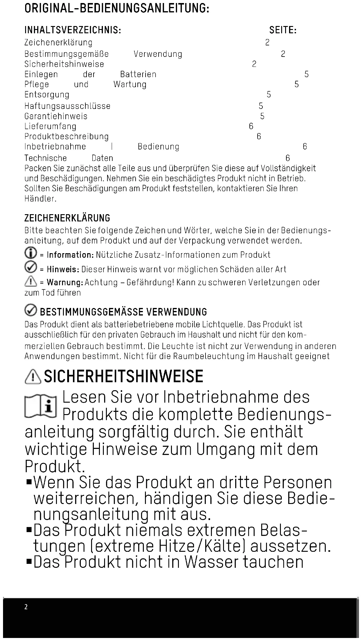 ORIGINAL-BEDIENUNGSANLEITUNG: INHALTSVERZEICHNIS: SEITE: Zeichenerklärung 2 Bestimmungsgemäße Verwendung 2 Sicherheitshinweise 2 Einlegen der Batterien 5 Pflege und Wartung 5 Entsorgung 5 Haftungsausschlüsse 5 Garantiehinweis 5 Lieferumfang 6 Produktbeschreibung 6 Inbetriebnahme | Bedienung 6 Technische Daten 6 Packen Sie zunächst alle Teile aus und überprüfen Sie diese auf Vollständigkeit und Beschädigungen. Nehmen Sie ein beschädigtes Produkt nicht in Betrieb. Sollten Sie Beschädigungen am Produkt feststellen, kontaktieren Sie Ihren Händler. ZEICHENERKLÄRUNG Bitte beachten Sie folgende Zeichen und Wörter, welche Sie in der Bedienungs- anleitung, auf dem Produkt und auf der Verpackung verwendet werden. = Information: Nützliche Zusatz-Informationen zum Produkt = Hinweis: Dieser Hinweis warnt vor möglichen Schäden aller Art = Warnung: Achtung – Gefährdung! Kann zu schweren Verletzungen oder zum Tod führen