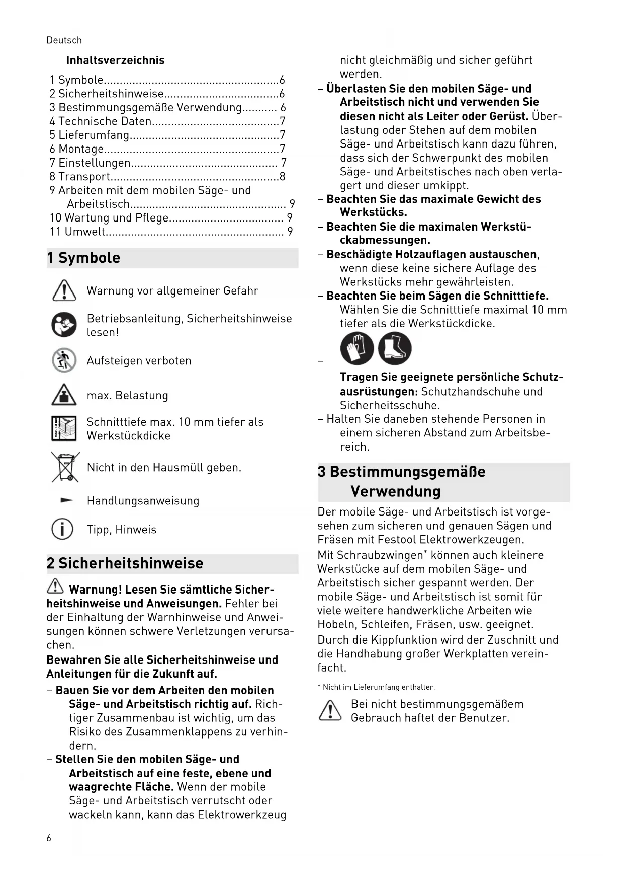 - 11 Umwelt 1 Symbole Warnung vor allgemeiner Gefahr Betriebsanleitung, Sicherheitshinweise lesen! Aufsteigen verboten max. Belastung max. 10 mm Schnitttiefe max. 10 mm tiefer als Werkstückdicke Nicht in den Hausmüll geben. Handlungsanweisung Tipp, Hinweis 2 Sicherheitshinweise Warnung! Lesen Sie sämtliche Sicher heitshinweise und Anweisungen. Fehler bei der Einhaltung der Warnhinweise und Anwei sungen können schwere Verletzungen verursa chen. Bewahren Sie alle Sicherheitshinweise und Anleitungen für die Zukunft auf. – Bauen Sie vor dem Arbeiten den mobilen Säge- und Arbeitstisch richtig auf. Rich tiger Zusammenbau ist wichtig, um das Risiko des Zusammenklappens zu verhin dern. – Stellen Sie den mobilen Säge- und Arbeitstisch auf eine feste, ebene und waagrechte Fläche. Wenn der mobile Säge- und Arbeitstisch verrutscht oder wackeln kann, kann das Elektrowerkzeug nicht gleichmäßig und sicher geführt werden. – Überlasten Sie den mobilen Säge- und Arbeitstisch nicht und verwenden Sie diesen nicht als Leiter oder Gerüst. Über lastung oder Stehen auf dem mobilen Säge- und Arbeitstisch kann dazu führen, dass sich der Schwerpunkt des mobilen Säge- und Arbeitstisches nach oben verla gert und dieser umkippt. – Beachten Sie das maximale Gewicht des Werkstücks. – Beachten Sie die maximalen Werkstü ckabmessungen. – Beschädigte Holzauflagen austauschen, wenn diese keine sichere Auflage des Werkstücks mehr gewährleisten. – Beachten Sie beim Sägen die Schnitttiefe. Wählen Sie die Schnitttiefe maximal 10 mm tiefer als die Werkstückdicke. p. 9