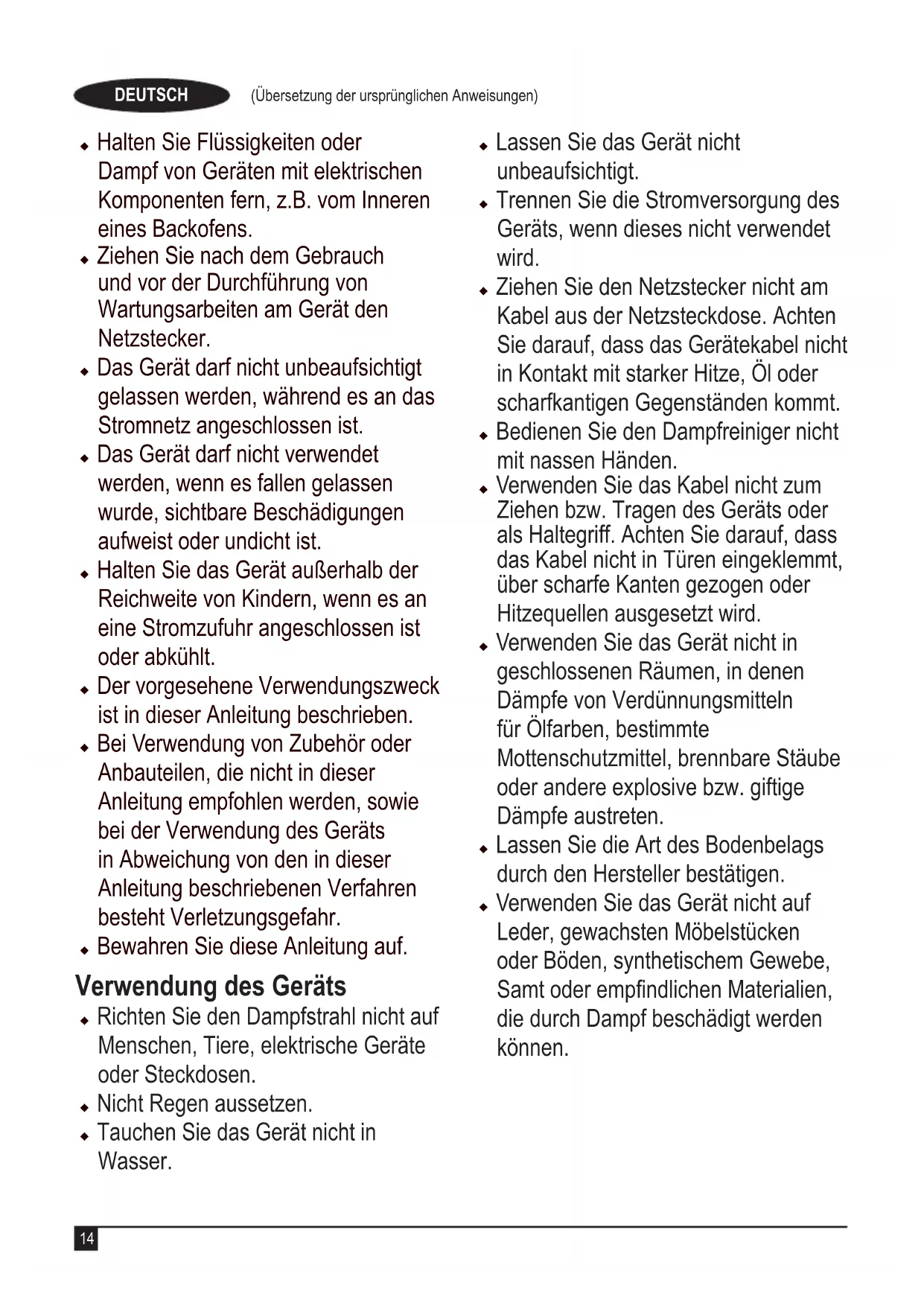 Warnung! Beachten Sie beim Umgang mit netzstrombetrie- benen Geräten stets die grund- legenden Sicherheitshinweise, die im Folgenden beschrieben werden. Dadurch verhindern Sie Brände, Stromschläge sowie Sach- und Personen- schäden. u Das Werkzeug darf von Personen mit eingeschränkten körperlichen, sensorischen oder geistigen Fähigkeiten sowie mangelnder Erfahrung und Wissen in Bezug auf dessen Gebrauch bedient werden, wenn sie bei der Verwendung des Geräts beaufsichtigt oder angeleitet werden und die möglichen Gefahren verstehen. Kinder dürfen nicht mit dem Gerät spielen.14 (Übersetzung der ursprünglichen Anweisungen) DEUTSCH u Halten Sie Flüssigkeiten oder Dampf von Geräten mit elektrischen Komponenten fern, z.B. vom Inneren eines Backofens. u Ziehen Sie nach dem Gebrauch und vor der Durchführung von Wartungsarbeiten am Gerät den Netzstecker. u Das Gerät darf nicht unbeaufsichtigt gelassen werden, während es an das Stromnetz angeschlossen ist. u Das Gerät darf nicht verwendet werden, wenn es fallen gelassen wurde, sichtbare Beschädigungen aufweist oder undicht ist. u Halten Sie das Gerät außerhalb der Reichweite von Kindern, wenn es an eine Stromzufuhr angeschlossen ist oder abkühlt. u Der vorgesehene Verwendungszweck ist in dieser Anleitung beschrieben. u Bei Verwendung von Zubehör oder Anbauteilen, die nicht in dieser Anleitung empfohlen werden, sowie bei der Verwendung des Geräts in Abweichung von den in dieser Anleitung beschriebenen Verfahren besteht Verletzungsgefahr. u Bewahren Sie diese Anleitung auf. Verwendung des Geräts u Richten Sie den Dampfstrahl nicht auf Menschen, Tiere, elektrische Geräte oder Steckdosen. u Nicht Regen aussetzen. u Tauchen Sie das Gerät nicht in Wasser. u Lassen Sie das Gerät nicht unbeaufsichtigt. u Trennen Sie die Stromversorgung des Geräts, wenn dieses nicht verwendet wird. u Ziehen Sie den Netzstecker nicht am Kabel aus der Netzsteckdose. Achten Sie darauf, dass das Gerätekabel nicht in Kontakt mit starker Hitze, Öl oder scharfkantigen Gegenständen kommt. u Bedienen Sie den Dampfreiniger nicht mit nassen Händen. u Verwenden Sie das Kabel nicht zum Ziehen bzw. Tragen des Geräts oder als Haltegriff. Achten Sie darauf, dass das Kabel nicht in Türen eingeklemmt, über scharfe Kanten gezogen oder Hitzequellen ausgesetzt wird. u Verwenden Sie das Gerät nicht in geschlossenen Räumen, in denen Dämpfe von Verdünnungsmitteln für Ölfarben, bestimmte Mottenschutzmittel, brennbare Stäube oder andere explosive bzw. giftige Dämpfe austreten. u Lassen Sie die Art des Bodenbelags durch den Hersteller bestätigen. u Verwenden Sie das Gerät nicht auf Leder, gewachsten Möbelstücken oder Böden, synthetischem Gewebe, Samt oder empndlichen Materialien, die durch Dampf beschädigt werden können.15 (Übersetzung der ursprünglichen Anweisungen) DEUTSCH
