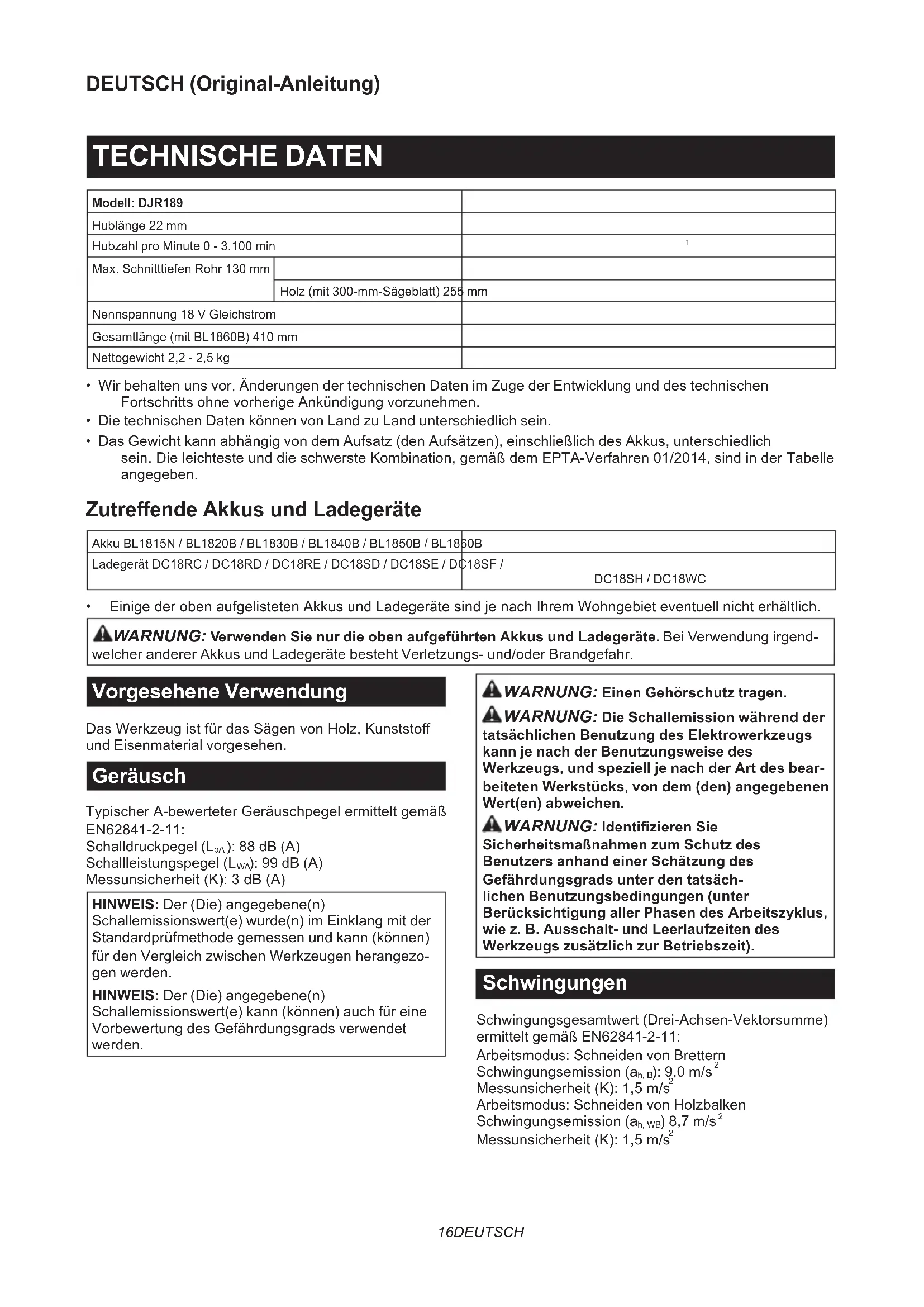 - EinigederobenaufgelistetenAkkusundLadegerätesindjenachIhremWohngebieteventuellnichterhältlich. WARNUNG: Verwenden Sie nur die oben aufgeführten Akkus und Ladegeräte. Bei Verwendung irgend- welcher anderer Akkus und Ladegeräte besteht Verletzungs- und/oder Brandgefahr. Vorgesehene Verwendung DasWerkzeugistfürdasSägenvonHolz,Kunststo und Eisenmaterial vorgesehen. Geräusch TypischerA-bewerteterGeräuschpegelermitteltgemäß EN62841-2-11: Schalldruckpegel (L