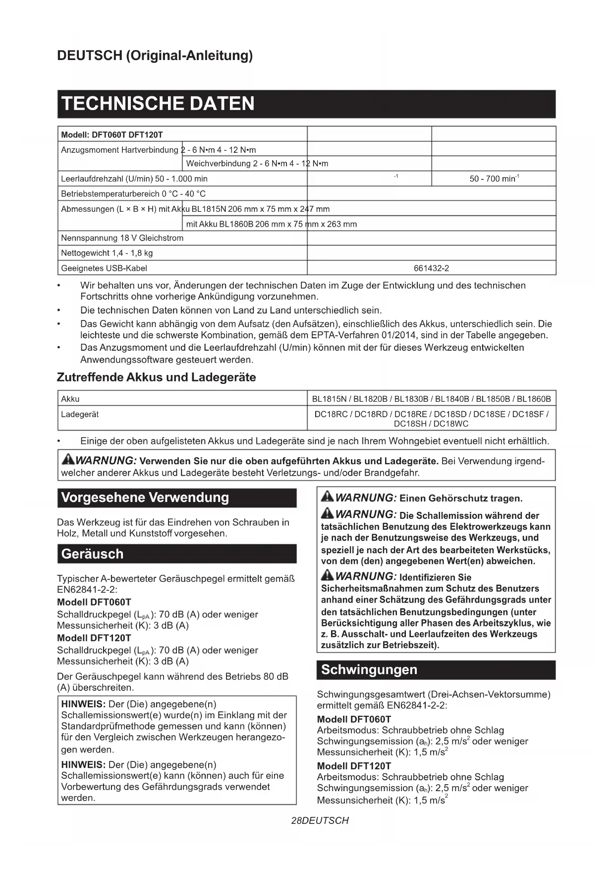 - Einige der oben aufgelisteten Akkus und Ladegeräte sind je nach Ihrem Wohngebiet eventuell nicht erhältlich. WARNUNG: Verwenden Sie nur die oben aufgeführten Akkus und Ladegeräte. Bei Verwendung irgend- welcher anderer Akkus und Ladegeräte besteht Verletzungs- und/oder Brandgefahr. Vorgesehene Verwendung Das Werkzeug ist für das Eindrehen von Schrauben in Holz,MetallundKunststovorgesehen. Geräusch Typischer A-bewerteter Geräuschpegel ermittelt gemäß EN62841-2-2: Modell DFT060T Schalldruckpegel (L