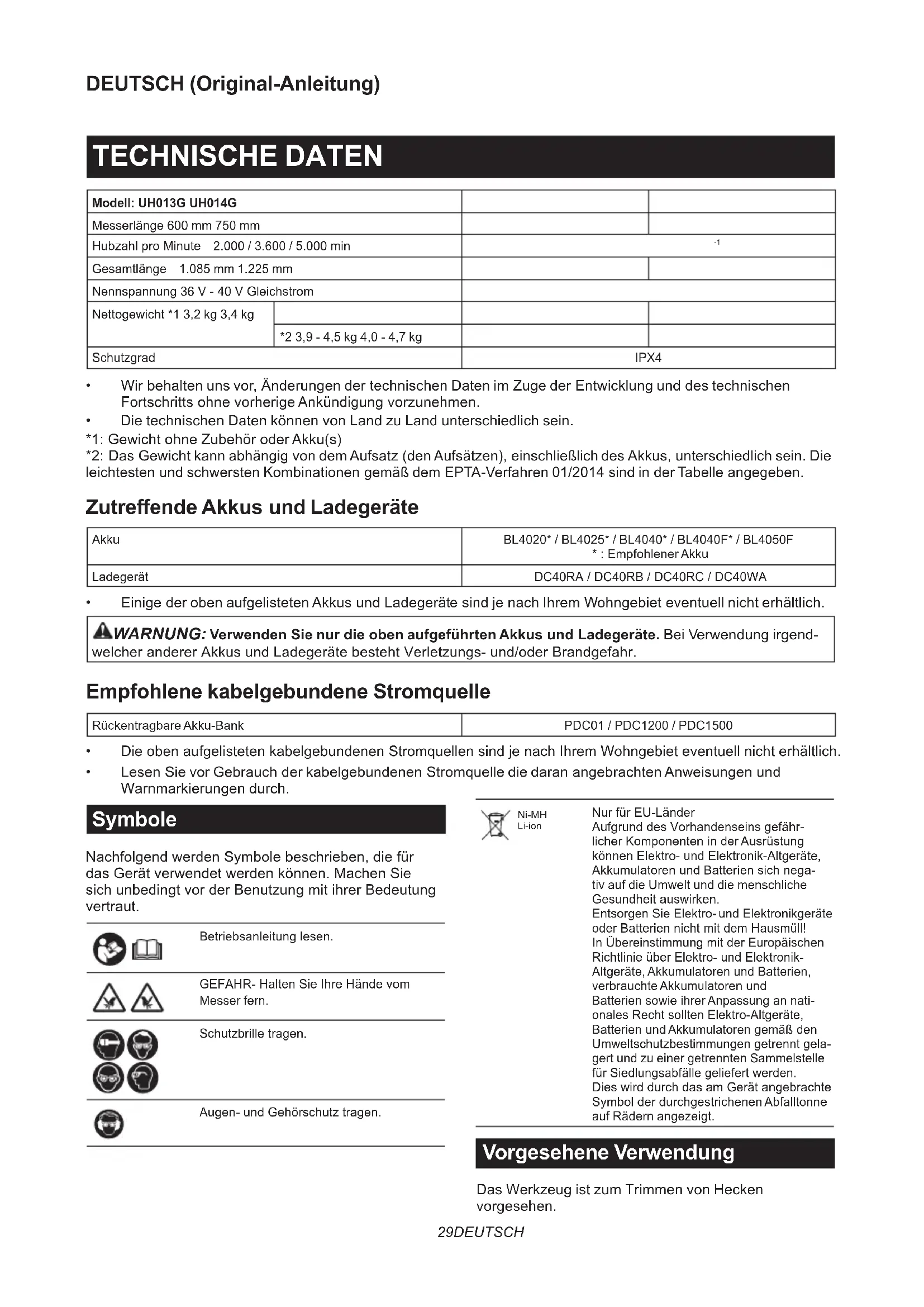 - LesenSievorGebrauchderkabelgebundenenStromquellediedaranangebrachtenAnweisungenund Warnmarkierungen durch. Symbole NachfolgendwerdenSymbolebeschrieben,diefür dasGerätverwendetwerdenkönnen.MachenSie sichunbedingtvorderBenutzungmitihrerBedeutung vertraut. Betriebsanleitunglesen. GEFAHR-HaltenSieIhreHändevom Messer fern. Schutzbrilletragen. Augen-undGehörschutztragen. Ni-MH Li-ion NurfürEU-Länder AufgrunddesVorhandenseinsgefähr- licherKomponenteninderAusrüstung könnenElektro-undElektronik-Altgeräte, AkkumulatorenundBatteriensichnega- tiv auf die Umwelt und die menschliche Gesundheitauswirken. EntsorgenSieElektro-undElektronikgeräte oderBatteriennichtmitdemHausmüll! InÜbereinstimmungmitderEuropäischen RichtlinieüberElektro-undElektronik- Altgeräte,AkkumulatorenundBatterien, verbrauchteAkkumulatorenund BatteriensowieihrerAnpassungannati- onalesRechtsolltenElektro-Altgeräte, BatterienundAkkumulatorengemäßden Umweltschutzbestimmungengetrenntgela- gert und zu einer getrennten Sammelstelle fürSiedlungsabfällegeliefertwerden. DieswirddurchdasamGerätangebrachte SymbolderdurchgestrichenenAbfalltonne auf Rädern angezeigt. Vorgesehene Verwendung Das Werkzeug ist zum Trimmen von Hecken vorgesehen.30 DEUTSCH Geräusch TypischerA-bewerteterGeräuschpegelermitteltgemäßEN62841-4-2: Modell Schalldruckpegel Garantier- ter Schall- leistungs- pegel Gemessener Schallleistungspegel