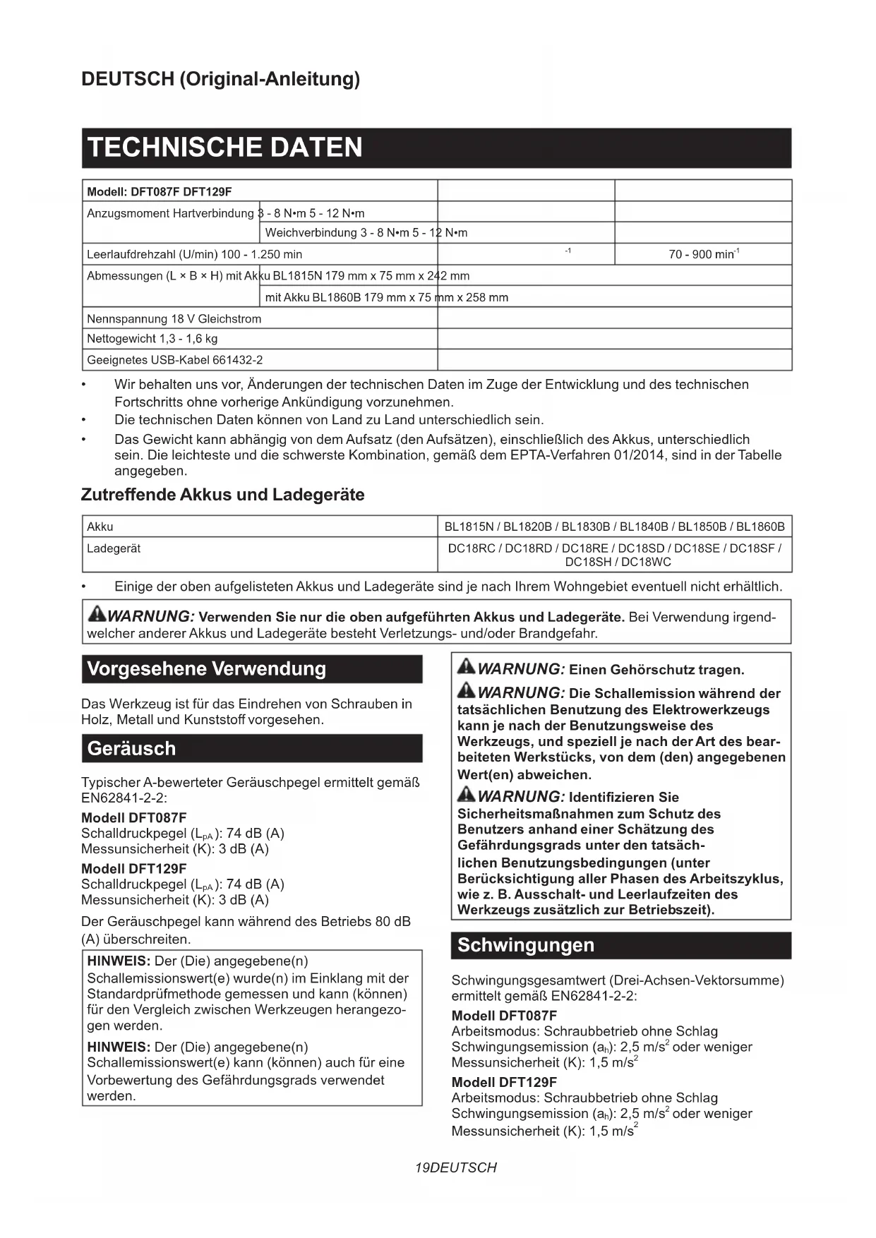 - Einige der oben aufgelisteten Akkus und Ladegeräte sind je nach Ihrem Wohngebiet eventuell nicht erhältlich. WARNUNG: Verwenden Sie nur die oben aufgeführten Akkus und Ladegeräte. Bei Verwendung irgend- welcher anderer Akkus und Ladegeräte besteht Verletzungs- und/oder Brandgefahr. Vorgesehene Verwendung Das Werkzeug ist für das Eindrehen von Schrauben in Holz,MetallundKunststovorgesehen. Geräusch Typischer A-bewerteter Geräuschpegel ermittelt gemäß EN62841-2-2: Modell DFT087F Schalldruckpegel (L