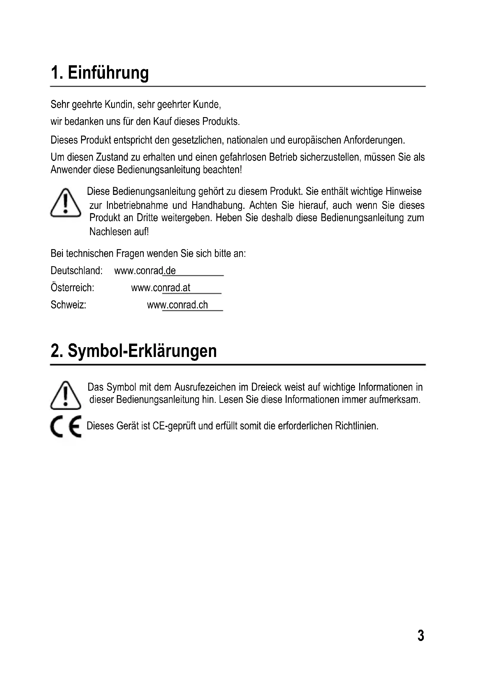 Sehr geehrte Kundin, sehr geehrter Kunde, wir bedanken uns für den Kauf dieses Produkts. Dieses Produkt entspricht den gesetzlichen, nationalen und europäischen Anforderungen. Um diesen Zustand zu erhalten und einen gefahrlosen Betrieb sicherzustellen, müssen Sie als Anwender diese Bedienungsanleitung beachten! Diese Bedienungsanleitung gehört zu diesem Produkt. Sie enthält wichtige Hinweise zur Inbetriebnahme und Handhabung. Achten Sie hierauf, auch wenn Sie dieses Produkt an Dritte weitergeben. Heben Sie deshalb diese Bedienungsanleitung zum Nachlesen auf! Bei technischen Fragen wenden Sie sich bitte an: Deutschland: www.conrad.de Österreich: www.conrad.at Schweiz: www.conrad.ch
