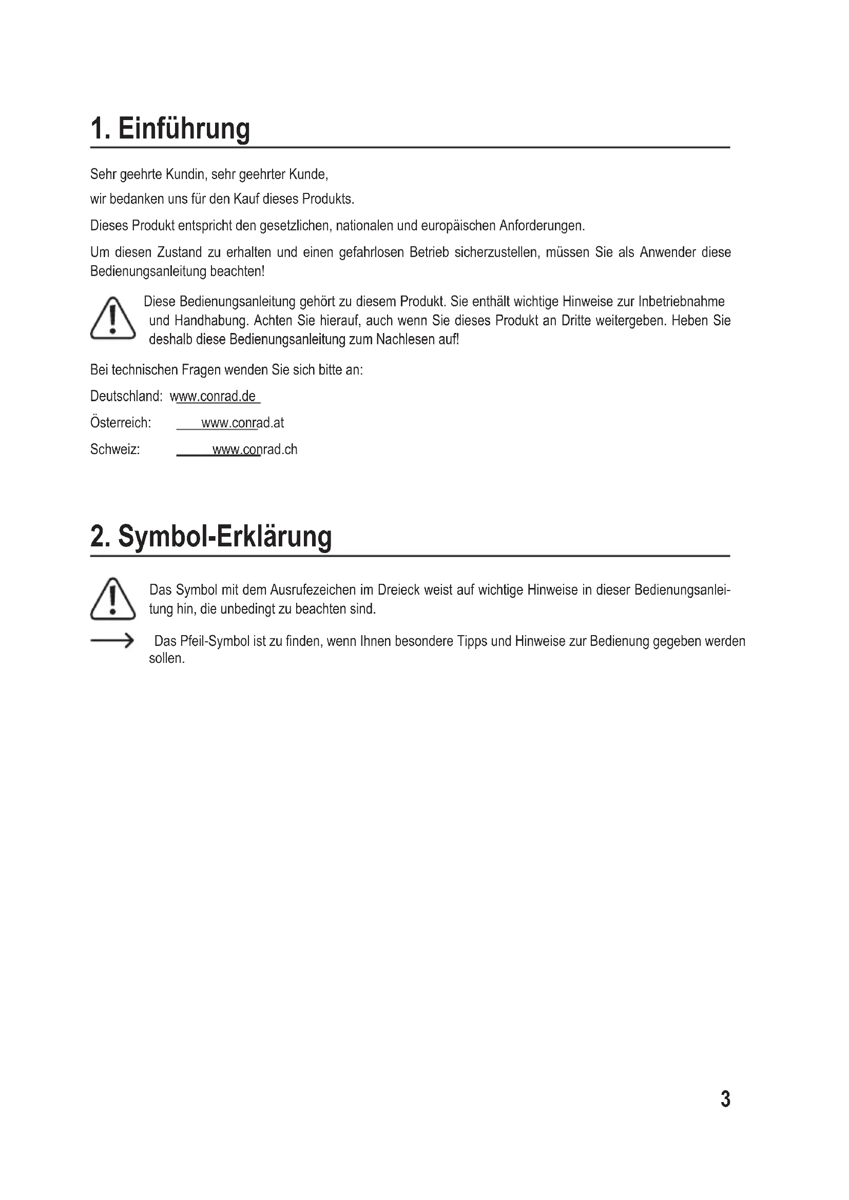 Sehr geehrte Kundin, sehr geehrter Kunde, wir bedanken uns für den Kauf dieses Produkts. Dieses Produkt entspricht den gesetzlichen, nationalen und europäischen Anforderungen. Um diesen Zustand zu erhalten und einen gefahrlosen Betrieb sicherzustellen, müssen Sie als Anwender diese Bedienungsanleitung beachten! Diese Bedienungsanleitung gehört zu diesem Produkt. Sie enthält wichtige Hinweise zur Inbetriebnahme und Handhabung. Achten Sie hierauf, auch wenn Sie dieses Produkt an Dritte weitergeben. Heben Sie deshalb diese Bedienungsanleitung zum Nachlesen auf! Bei technischen Fragen wenden Sie sich bitte an: Deutschland: www.conrad.de Österreich: www.conrad.at Schweiz: www.conrad.ch