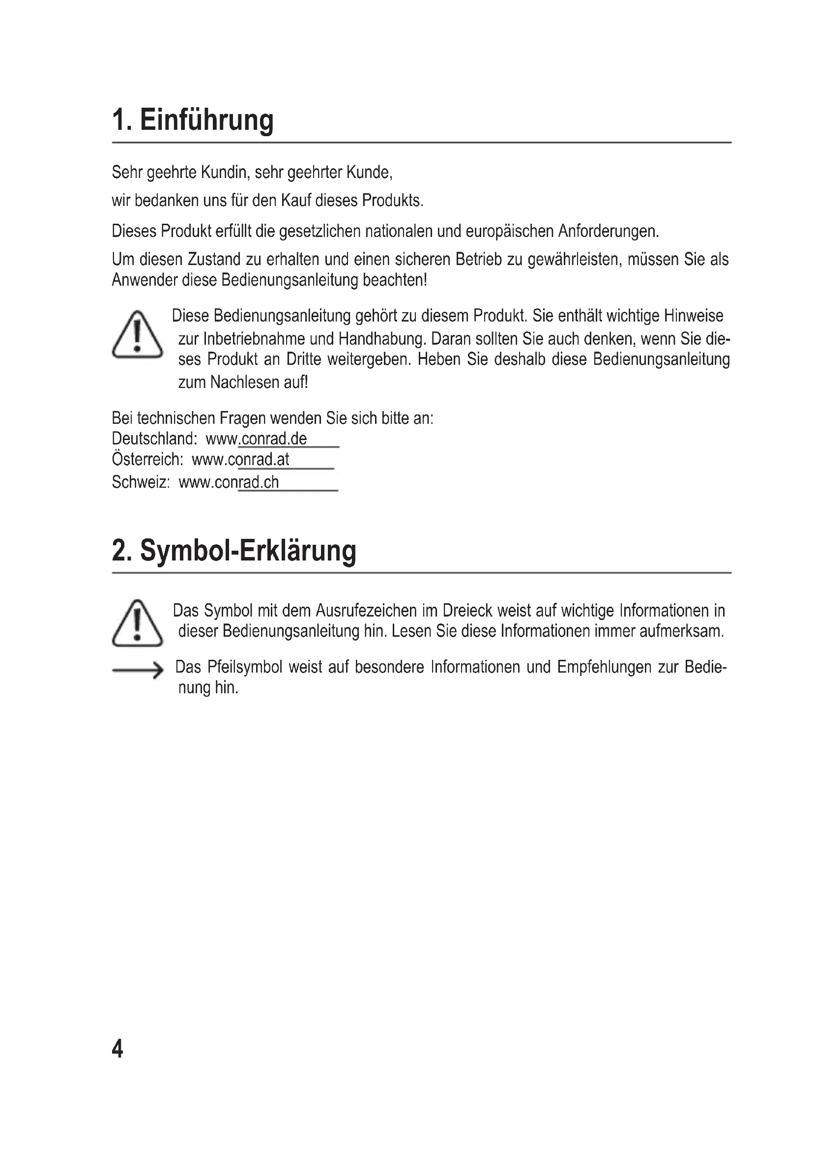 Sehr geehrte Kundin, sehr geehrter Kunde, wir bedanken uns für den Kauf dieses Produkts. Dieses Produkt erfüllt die gesetzlichen nationalen und europäischen Anforderungen. Um diesen Zustand zu erhalten und einen sicheren Betrieb zu gewährleisten, müssen Sie als Anwender diese Bedienungsanleitung beachten! Diese Bedienungsanleitung gehört zu diesem Produkt. Sie enthält wichtige Hinweise zur Inbetriebnahme und Handhabung. Daran sollten Sie auch denken, wenn Sie die- ses Produkt an Dritte weitergeben. Heben Sie deshalb diese Bedienungsanleitung zum Nachlesen auf! Bei technischen Fragen wenden Sie sich bitte an: Deutschland: www.conrad.de Österreich: www.conrad.at Schweiz: www.conrad.ch