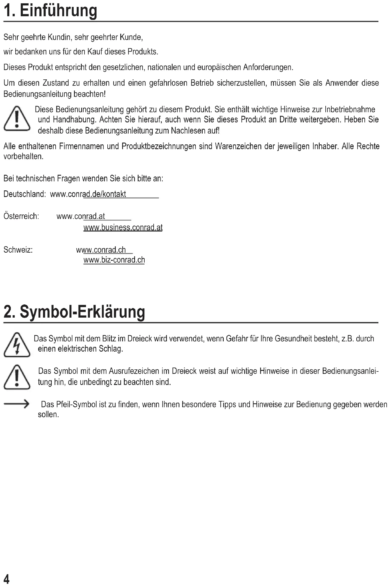 Sehr geehrte Kundin, sehr geehrter Kunde, wir bedanken uns für den Kauf dieses Produkts. Dieses Produkt entspricht den gesetzlichen, nationalen und europäischen Anforderungen. Um diesen Zustand zu erhalten und einen gefahrlosen Betrieb sicherzustellen, müssen Sie als Anwender diese Bedienungsanleitung beachten! Diese Bedienungsanleitung gehört zu diesem Produkt. Sie enthält wichtige Hinweise zur Inbetriebnahme und Handhabung. Achten Sie hierauf, auch wenn Sie dieses Produkt an Dritte weitergeben. Heben Sie deshalb diese Bedienungsanleitung zum Nachlesen auf! Alle enthaltenen Firmennamen und Produktbezeichnungen sind Warenzeichen der jeweiligen Inhaber. Alle Rechte vorbehalten. Bei technischen Fragen wenden Sie sich bitte an: Deutschland: www.conrad.de/kontakt Österreich: www.conrad.at www.business.conrad.at Schweiz: www.conrad.ch www.biz-conrad.ch