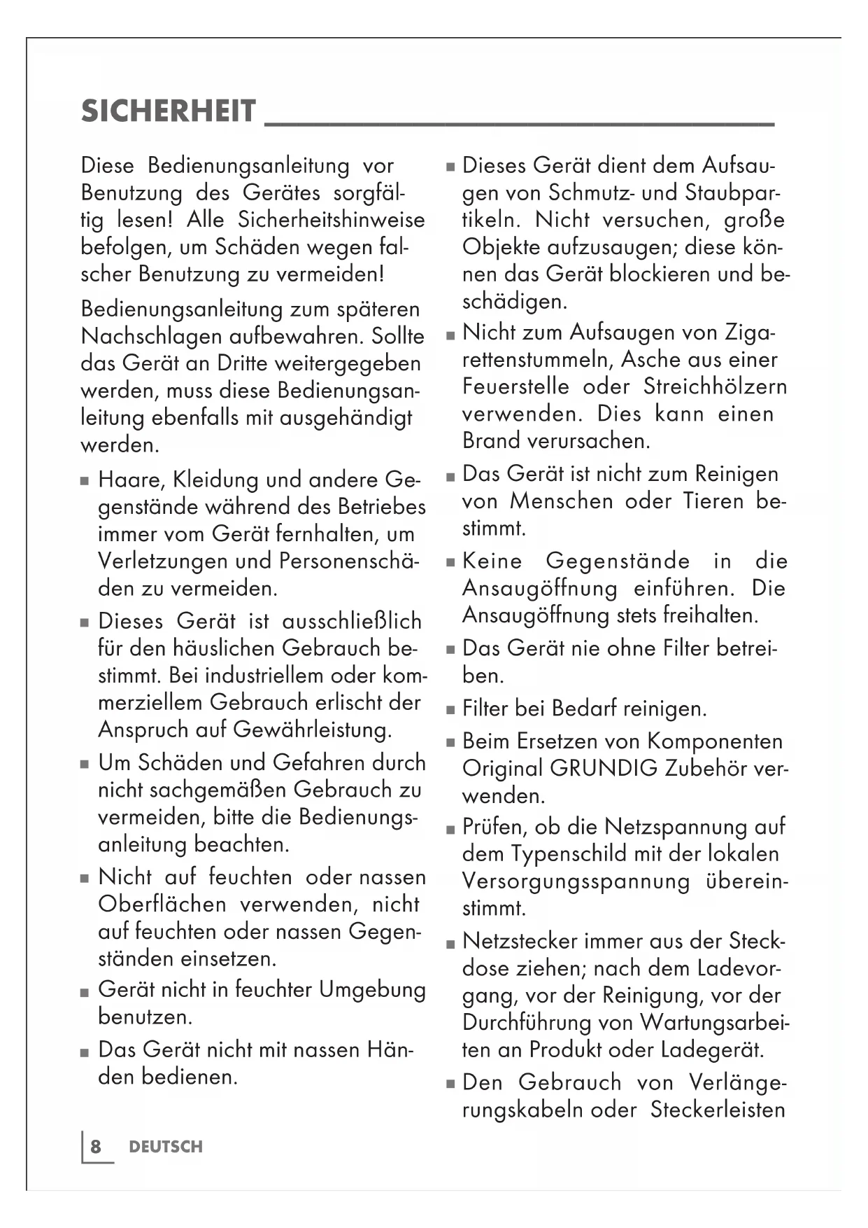 Werter Kunde: Herzlichen Glückwunsch zum Erwerb Ihres neuen GRUNDIG 2 in 1 Akku Stielstaubsaugers VCP 8930. Bitte lesen Sie die folgenden Hinweise sorgfältig, damit dieses Qualitätsprodukt aus dem Hause GRUNDIG viele Jahre lang gute Dienste leistet. Verantwortungsbewusstes Handeln! GRUNDIG setzt intern wie auch bei unseren Lieferanten auf vertraglich zugesicherte soziale Arbeits- bedingungen mit fairem Lohn, auf effizienten Rohstoffeinsatz bei stetiger Abfallreduzierung von mehreren Tonnen Plastik pro Jahr – und auf mindestens 5 Jahre Verfügbarkeit sämtlichen Zubehörs. Für eine lebenswerte Zukunft. Grundig. Bedienelemente Siehe Abbildung auf Seite 3.