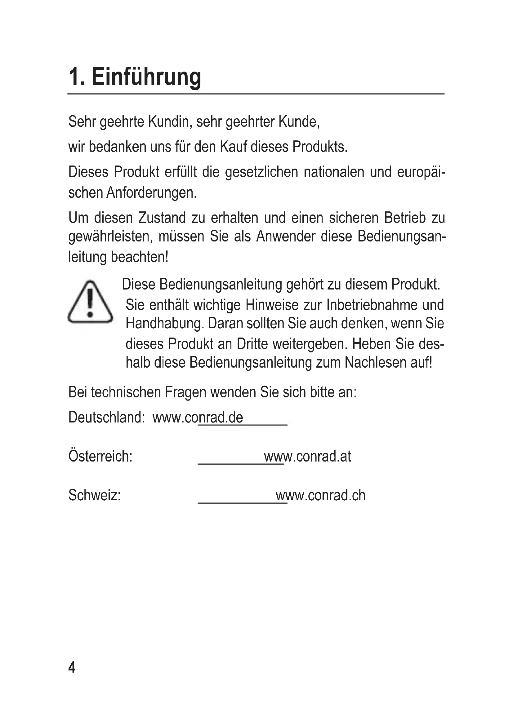 Sehr geehrte Kundin, sehr geehrter Kunde, wir bedanken uns für den Kauf dieses Produkts. Dieses Produkt erfüllt die gesetzlichen nationalen und europäi- schen Anforderungen. Um diesen Zustand zu erhalten und einen sicheren Betrieb zu gewährleisten, müssen Sie als Anwender diese Bedienungsan- leitung beachten! Diese Bedienungsanleitung gehört zu diesem Produkt. Sie enthält wichtige Hinweise zur Inbetriebnahme und Handhabung. Daran sollten Sie auch denken, wenn Sie dieses Produkt an Dritte weitergeben. Heben Sie des- halb diese Bedienungsanleitung zum Nachlesen auf! Bei technischen Fragen wenden Sie sich bitte an: Deutschland: www.conrad.de Österreich: www.conrad.at Schweiz: www.conrad.ch