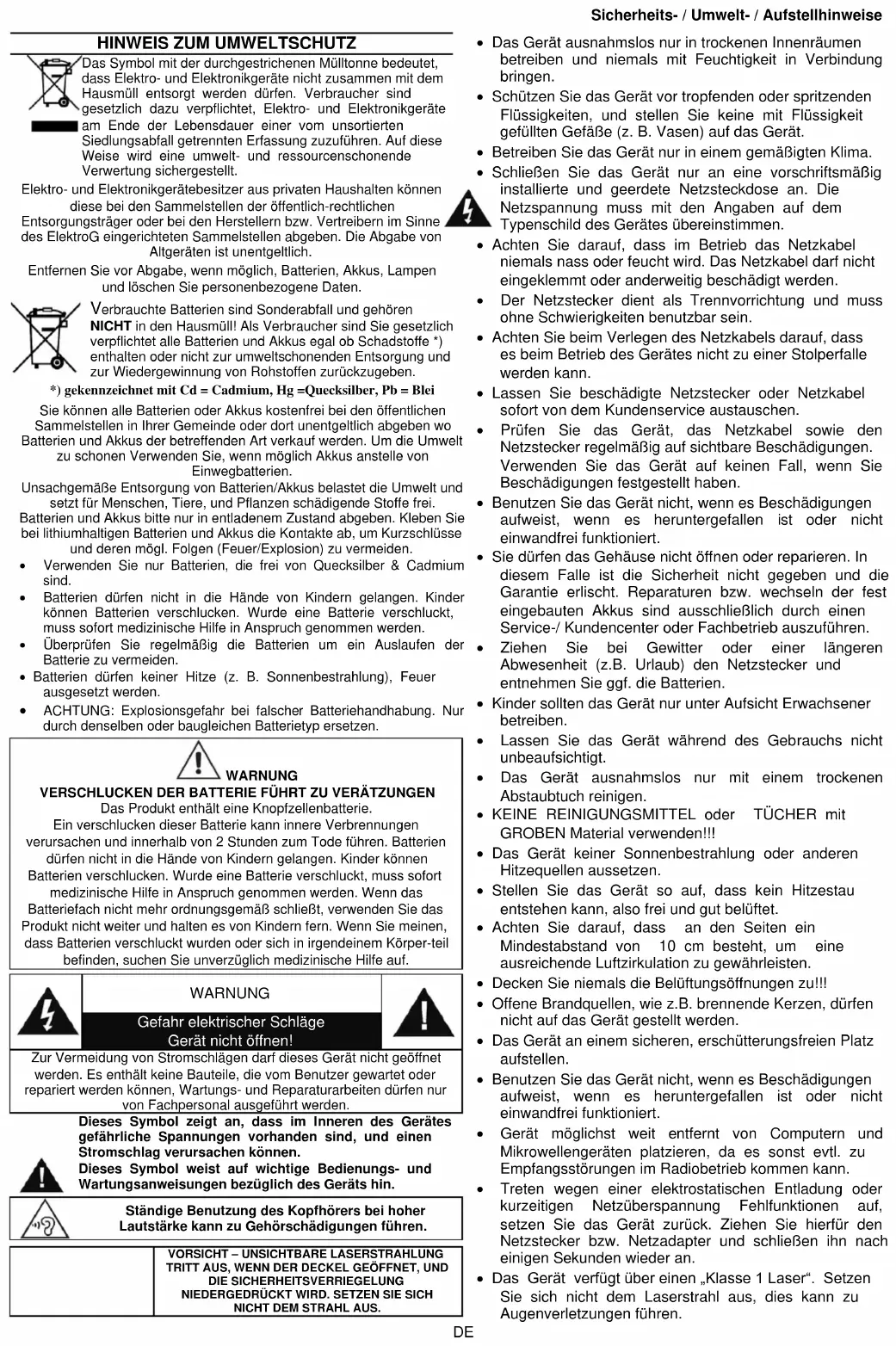 Verbrauchte Batterien sind Sonderabfall und gehören NICHT in den Hausmüll! Als Verbraucher sind Sie gesetzlich verpflichtet alle Batterien und Akkus egal ob Schadstoffe *) enthalten oder nicht zur umweltschonenden Entsorgung und zur Wiedergewinnung von Rohstoffen zurückzugeben. *) gekennzeichnet mit Cd = Cadmium, Hg =Quecksilber, Pb = Blei Sie können alle Batterien oder Akkus kostenfrei bei den öffentlichen Sammelstellen in Ihrer Gemeinde oder dort unentgeltlich abgeben wo Batterien und Akkus der betreffenden Art verkauf werden. Um die Umwelt zu schonen Verwenden Sie, wenn möglich Akkus anstelle von Einwegbatterien. Unsachgemäße Entsorgung von Batterien/Akkus belastet die Umwelt und setzt für Menschen, Tiere, und Pflanzen schädigende Stoffe frei. Batterien und Akkus bitte nur in entladenem Zustand abgeben. Kleben Sie bei lithiumhaltigen Batterien und Akkus die Kontakte ab, um Kurzschlüsse und deren mögl. Folgen (Feuer/Explosion) zu vermeiden.