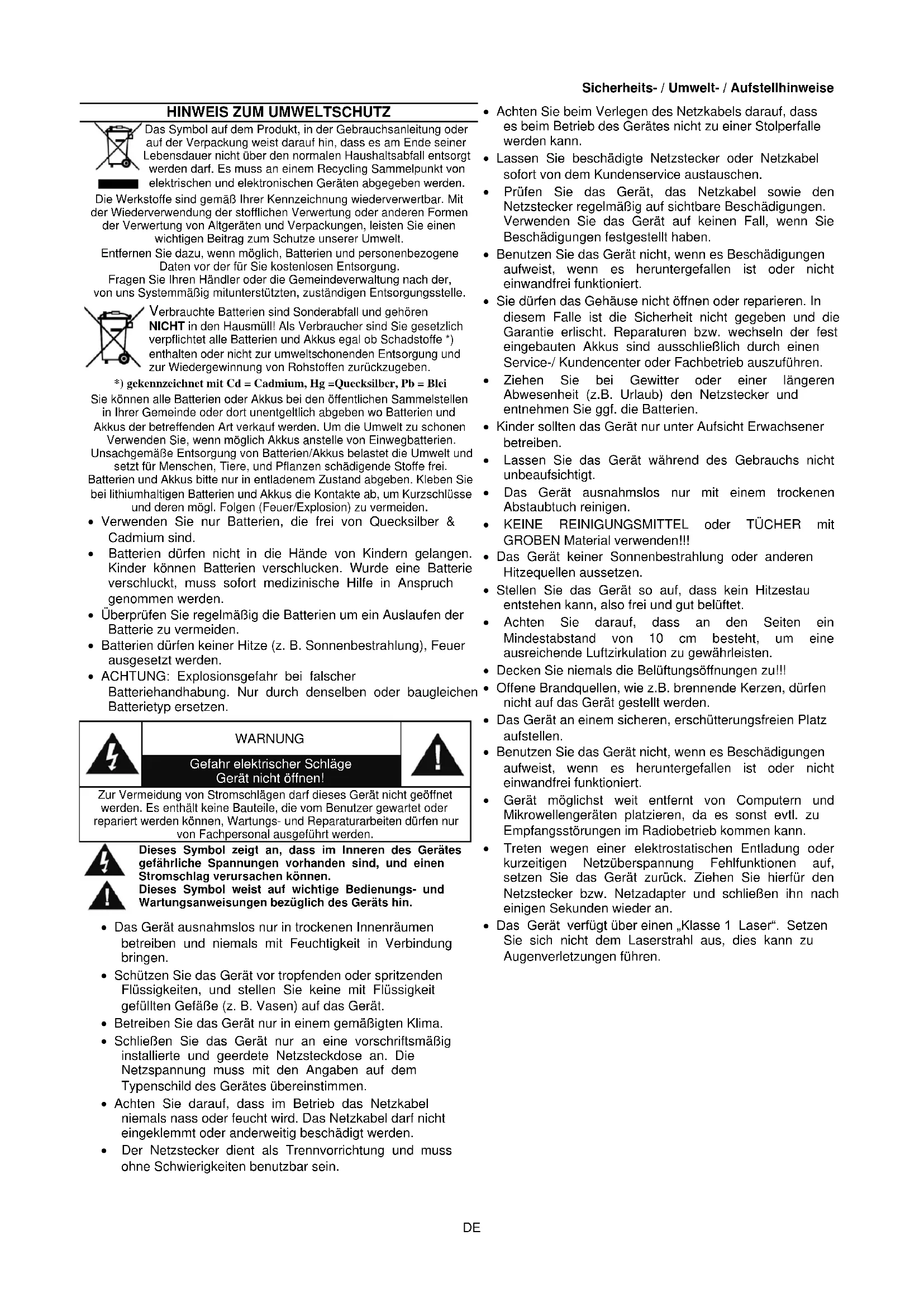 Verbrauchte Batterien sind Sonderabfall und gehören NICHT in den Hausmüll! Als Verbraucher sind Sie gesetzlich verpflichtet alle Batterien und Akkus egal ob Schadstoffe *) enthalten oder nicht zur umweltschonenden Entsorgung und zur Wiedergewinnung von Rohstoffen zurückzugeben. *) gekennzeichnet mit Cd = Cadmium, Hg =Quecksilber, Pb = Blei Sie können alle Batterien oder Akkus bei den öffentlichen Sammelstellen in Ihrer Gemeinde oder dort unentgeltlich abgeben wo Batterien und Akkus der betreffenden Art verkauf werden. Um die Umwelt zu schonen Verwenden Sie, wenn möglich Akkus anstelle von Einwegbatterien. Unsachgemäße Entsorgung von Batterien/Akkus belastet die Umwelt und setzt für Menschen, Tiere, und Pflanzen schädigende Stoffe frei. Batterien und Akkus bitte nur in entladenem Zustand abgeben. Kleben Sie bei lithiumhaltigen Batterien und Akkus die Kontakte ab, um Kurzschlüsse und deren mögl. Folgen (Feuer/Explosion) zu vermeiden.