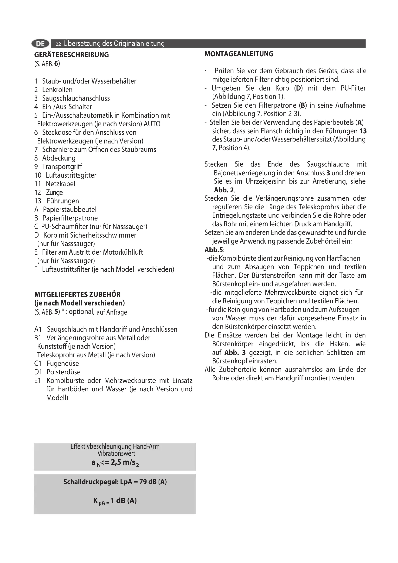 S. ABB . 5) * : optional, auf Anfrage A1 Saugschlauch mit Handgriff und Anschlüssen B1 Verlängerungsrohre aus Metall oder Kunststoff (je nach Version) Teleskoprohr aus Metall (je nach Version) C1 Fugendüse D1 Polsterdüse E1 Kombibürste oder Mehrzweckbürste mit Einsatz für Hartböden und Wasser (je nach Version und Modell) Schalldruckpegel: LpA = 79 dB (A) Effektivbeschleunigung Hand-Arm Vibrationswert