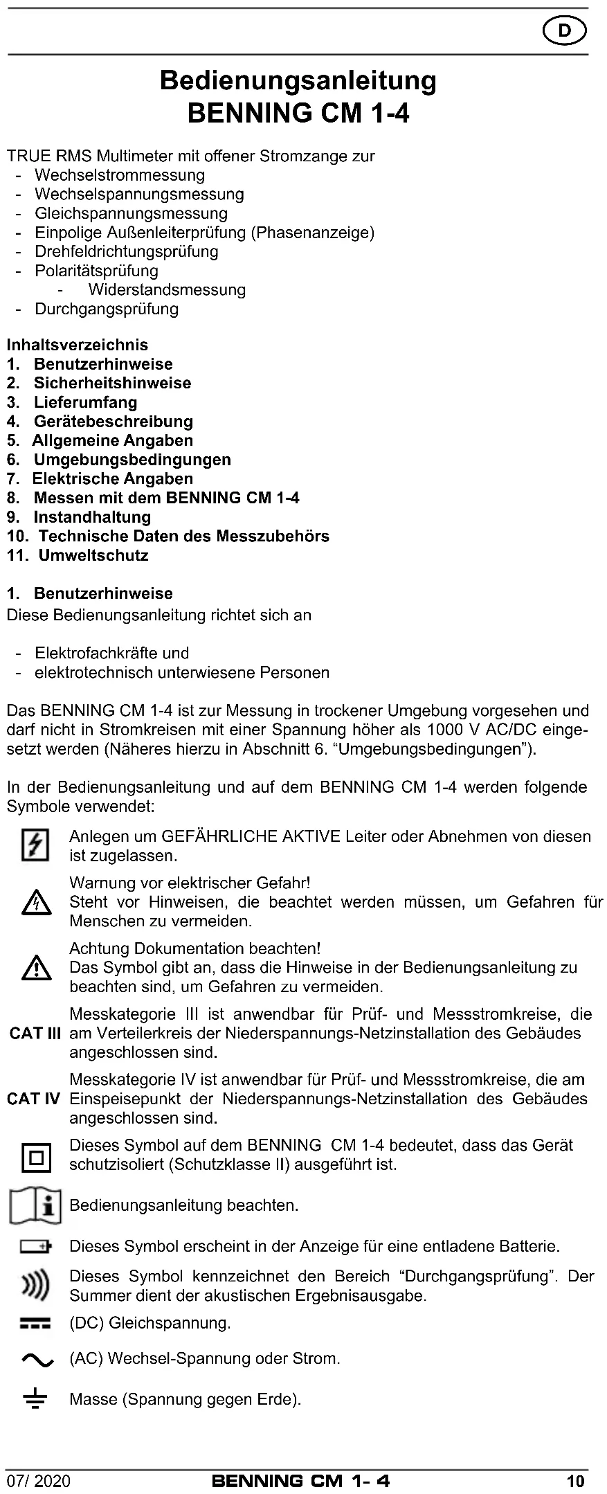 TRUE RMS Multimeter mit oener Stromzange zur - Wechselstrommessung - Wechselspannungsmessung - Gleichspannungsmessung - Einpolige Außenleiterprüfung (Phasenanzeige) - Drehfeldrichtungsprüfung - Polaritätsprüfung - Widerstandsmessung - DurchgangsprüfungInhaltsverzeichnis 1. Benutzerhinweise 2. Sicherheitshinweise 3. Lieferumfang 4. Gerätebeschreibung 5. Allgemeine Angaben 6. Umgebungsbedingungen 7. Elektrische Angaben 8. Messen mit dem BENNING CM 1-4 9. Instandhaltung 10. Technische Daten des Messzubehörs 11. Umweltschutz1. Benutzerhinweise Diese Bedienungsanleitung richtet sich an - Elektrofachkräfte und - elektrotechnisch unterwiesene Personen Das BENNING CM 1-4 ist zur Messung in trockener Umgebung vorgesehen und darf nicht in Stromkreisen mit einer Spannung höher als 1000 V AC/DC einge-setzt werden (Näheres hierzu in Abschnitt 6. “Umgebungsbedingungen”). In der Bedienungsanleitung und auf dem BENNING CM 1-4 werden folgende Symbole verwendet: Anlegen um GEFÄHRLICHE AKTIVE Leiter oder Abnehmen von diesen ist zugelassen. Warnung vor elektrischer Gefahr!Steht vor Hinweisen, die beachtet werden müssen, um Gefahren für Menschen zu vermeiden. Achtung Dokumentation beachten!Das Symbol gibt an, dass die Hinweise in der Bedienungsanleitung zu beachten sind, um Gefahren zu vermeiden.CAT IIIMesskategorie III ist anwendbar für Prüf- und Messstromkreise, die am Verteilerkreis der Niederspannungs-Netzinstallation des Gebäudes angeschlossen sind.CAT IVMesskategorie IV ist anwendbar für Prüf- und Messstromkreise, die am Einspeisepunkt der Niederspannungs-Netzinstallation des Gebäudes angeschlossen sind. Dieses Symbol auf dem BENNING CM 1-4 bedeutet, dass das Gerät schutzisoliert (Schutzklasse II) ausgeführt ist. Bedienungsanleitung beachten.Dieses Symbol erscheint in der Anzeige für eine entladene Batterie. Dieses Symbol kennzeichnet den Bereich “Durchgangsprüfung”. Der Summer dient der akustischen Ergebnisausgabe. (DC) Gleichspannung. (AC) Wechsel-Spannung oder Strom. Masse (Spannung gegen Erde).11