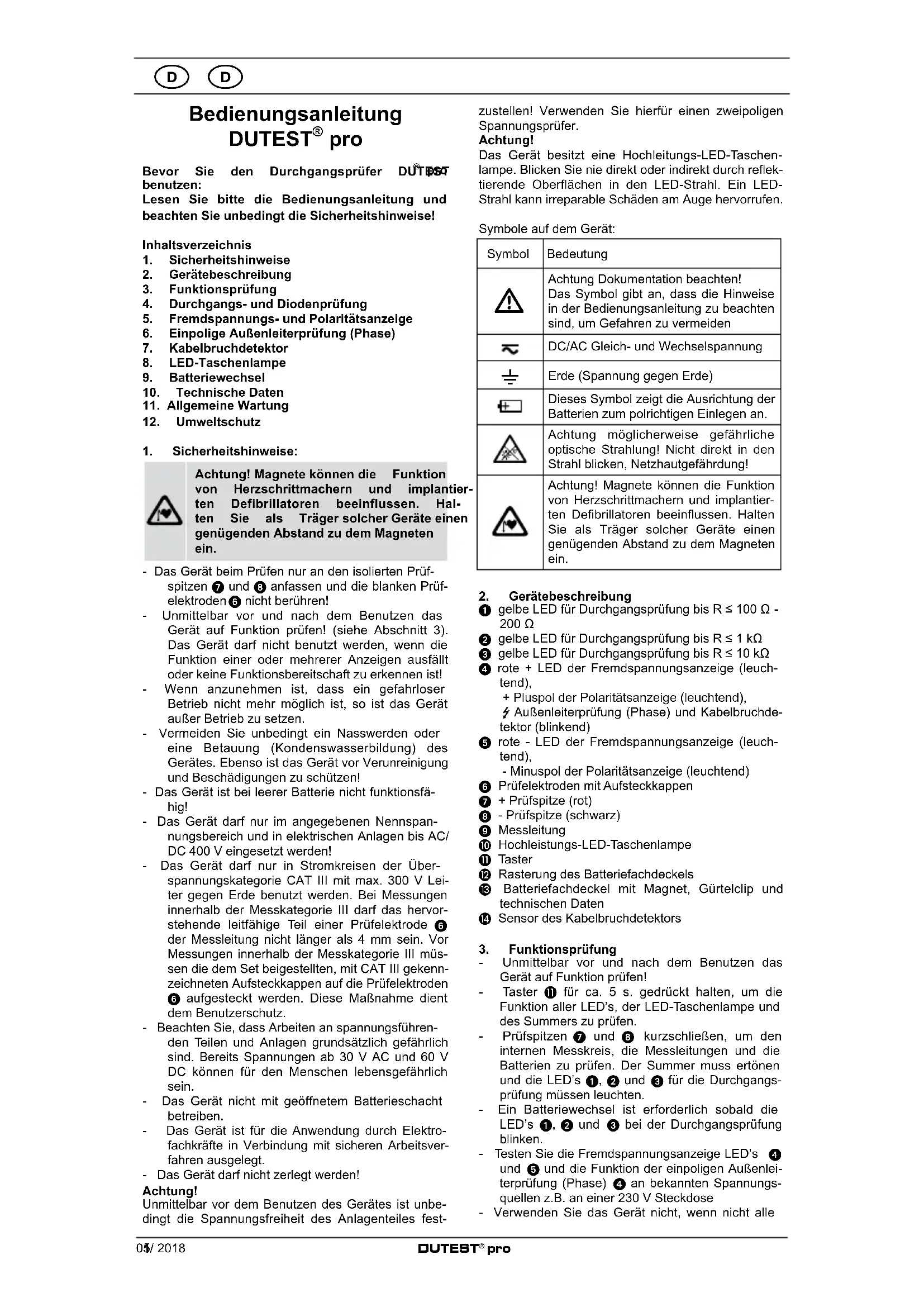 pro Mehrsprachige Anleitung unter www.benning.de Multilingual manuals at05/ 2018 DUTEST