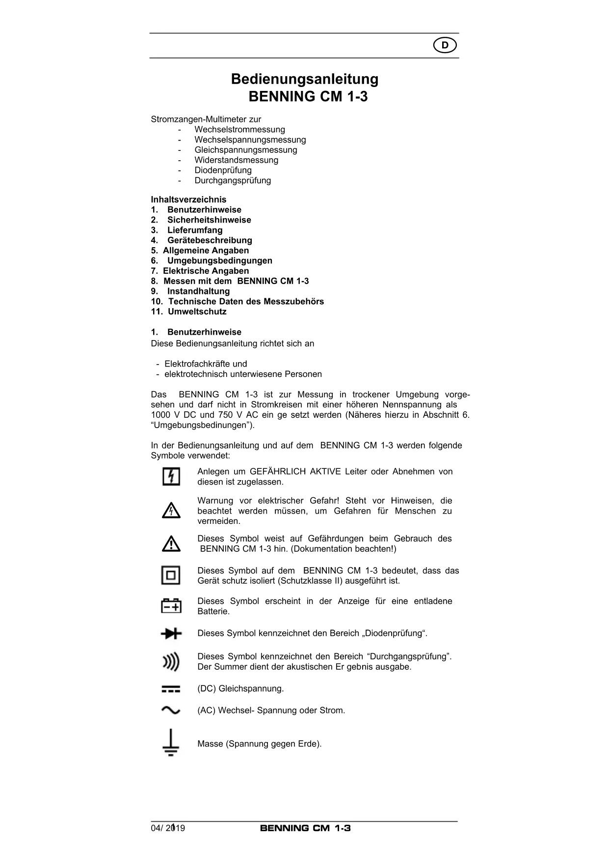 Dieses Symbol weist auf Gefährdungen beim Gebrauch des BENNING CM 1-3 hin. (Dokumentation beachten!) Dieses Symbol auf dem BENNING CM 1-3 bedeutet, dass das Gerät schutz isoliert (Schutzklasse II) ausgeführt ist. Dieses Symbol erscheint in der Anzeige für eine entladene Batterie. Dieses Symbol kennzeichnet den Bereich „Diodenprüfung“. Dieses Symbol kennzeichnet den Bereich “Durchgangsprüfung”. Der Summer dient der akustischen Er geb nis aus gabe. (DC) Gleichspannung. (AC) Wechsel- Spannung oder Strom. Masse (Spannung gegen Erde).04/ 2019