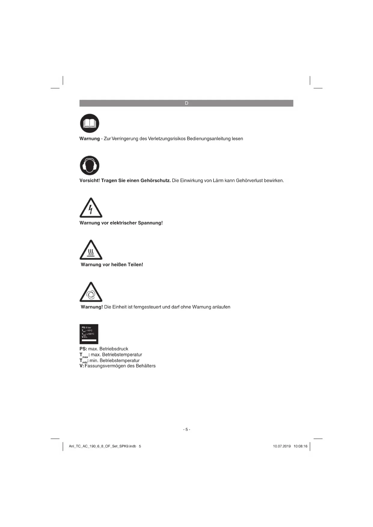 Vorsicht! Tragen Sie einen Gehörschutz. Die Einwirkung von Lärm kann Gehörverlust bewirken. Warnung vor elektrischer Spannung! Warnung vor heißen Teilen! Warnung! Die Einheit ist ferngesteuert und darf ohne Warnung anlaufen Warnung - Zur Verringerung des Verletzungsrisikos Bedienungsanleitung lesen PS: max. Betriebsdruck